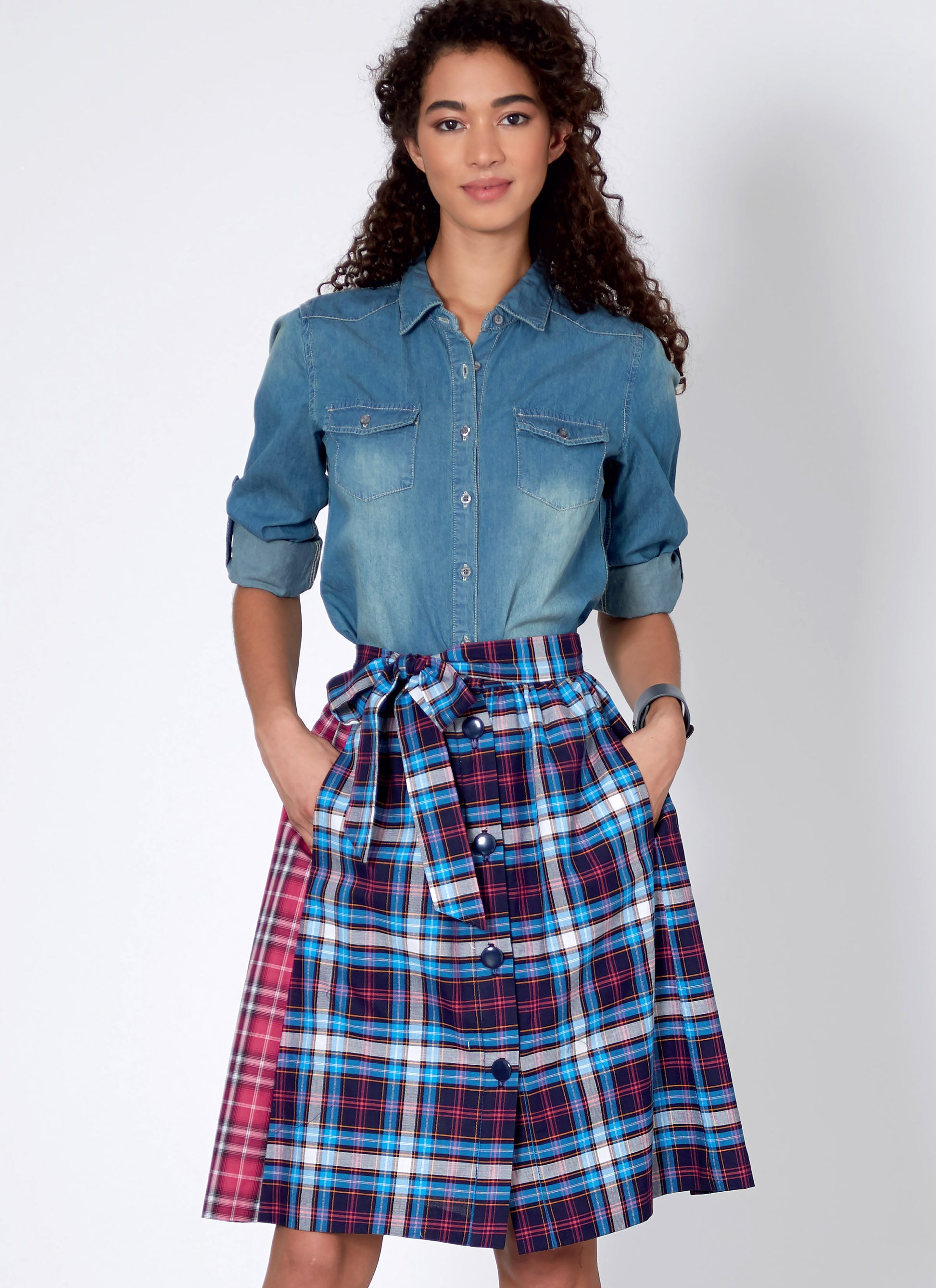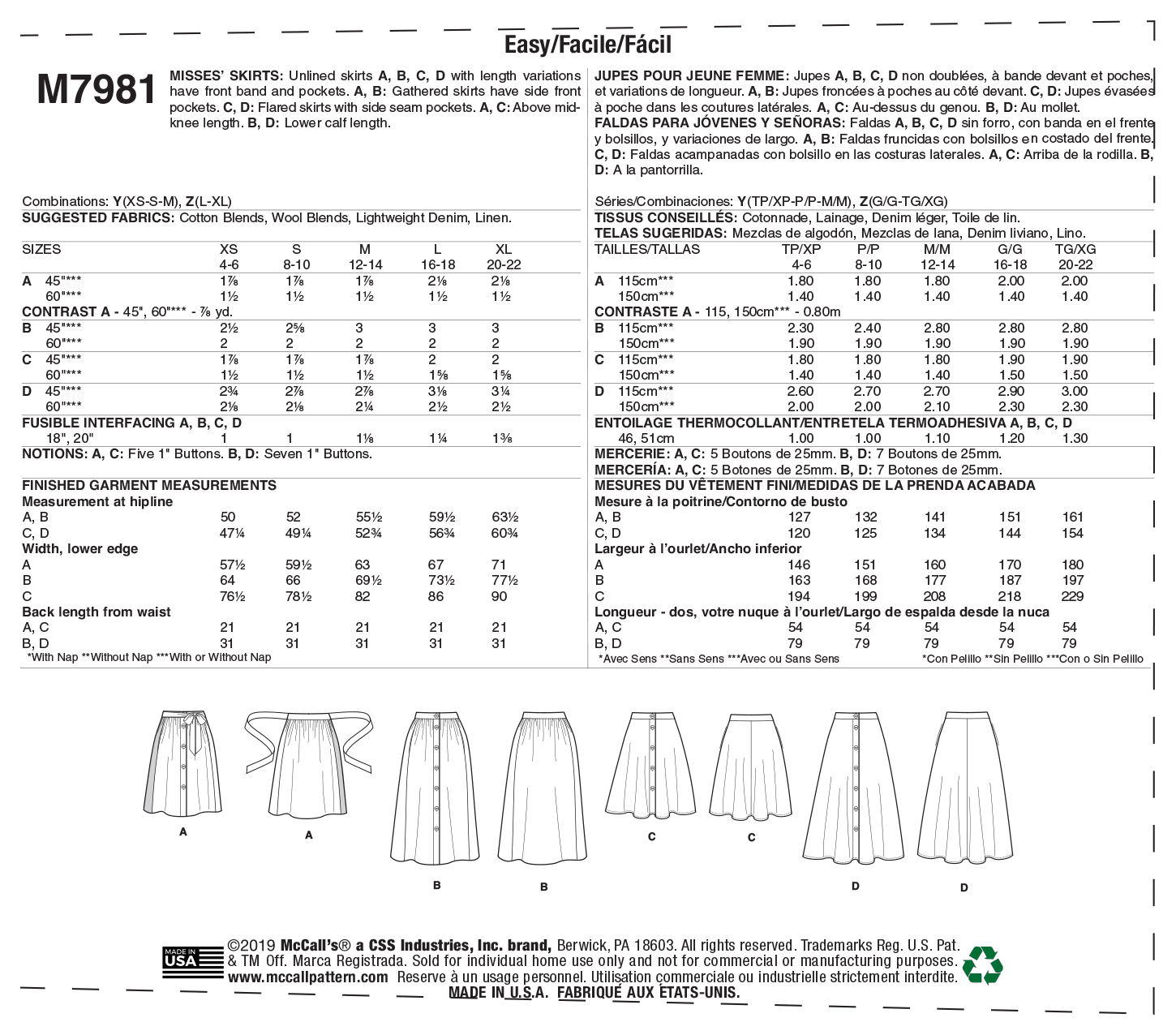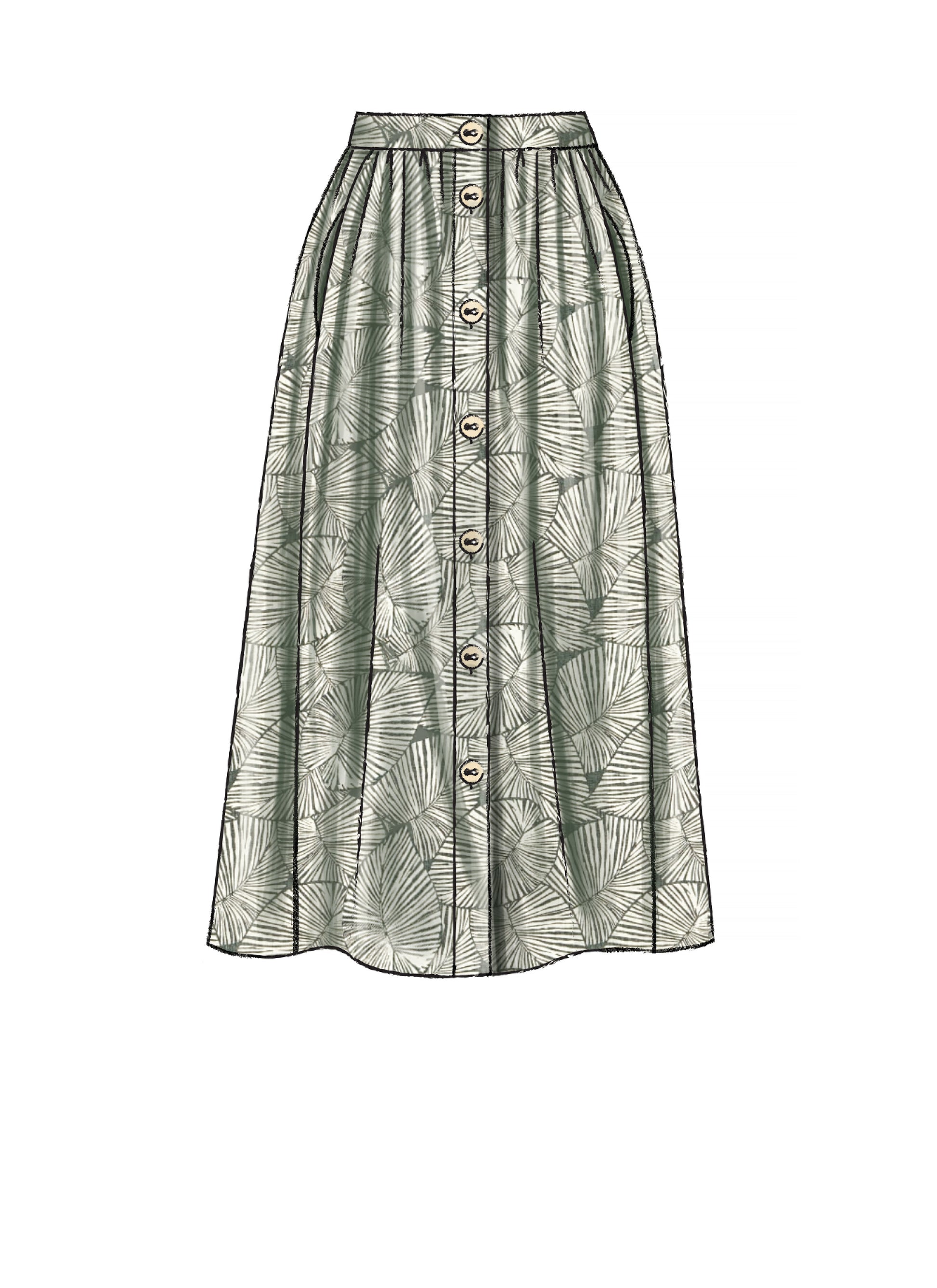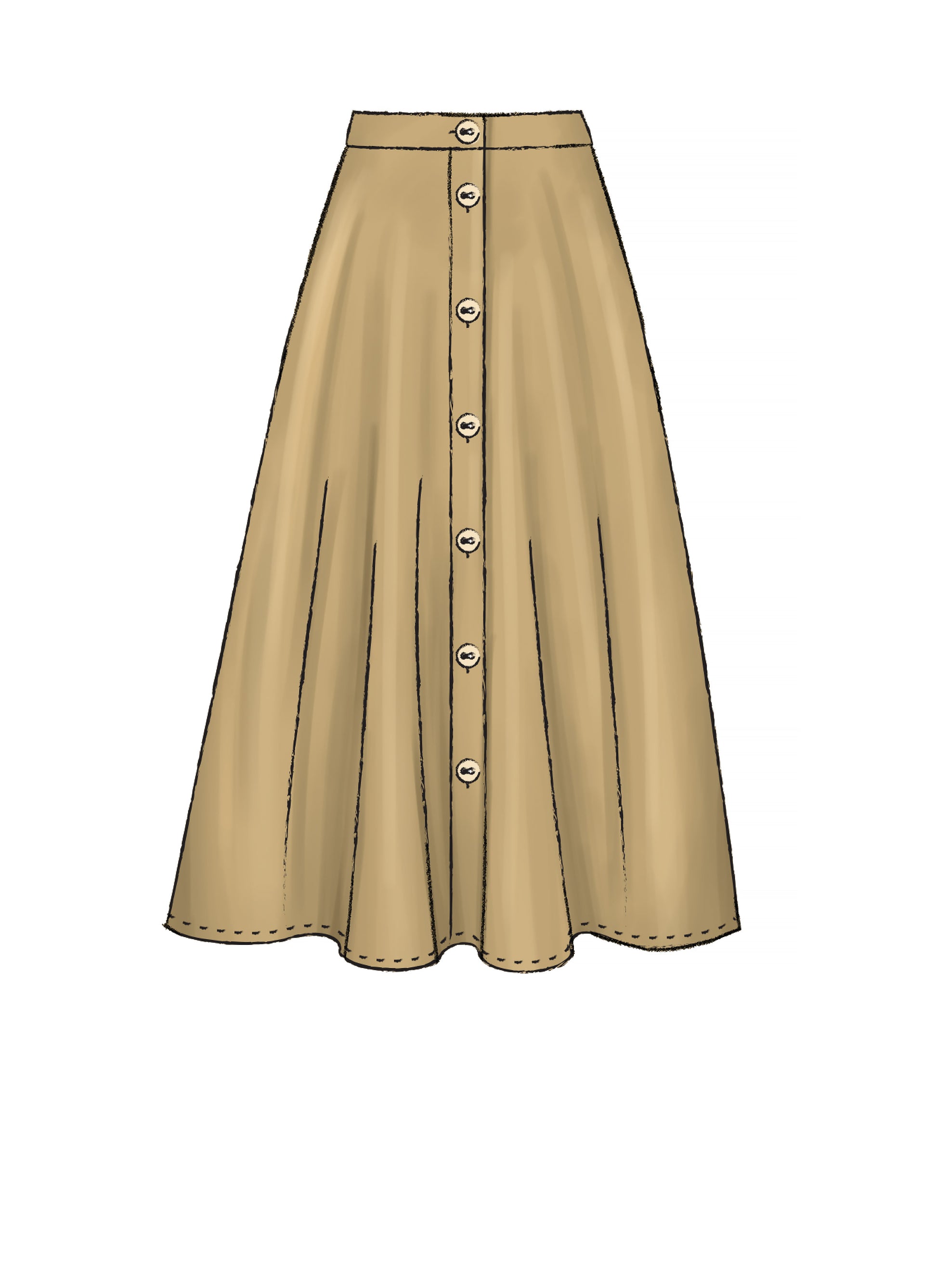 A, B, C, D: Unlined skirts with length variations have front band and pockets. A, B: Gathered skirts have side front pockets. C, D: Flared skirts with side seam pockets. A, C: Above mid-knee length. B, D: Lower calf length.