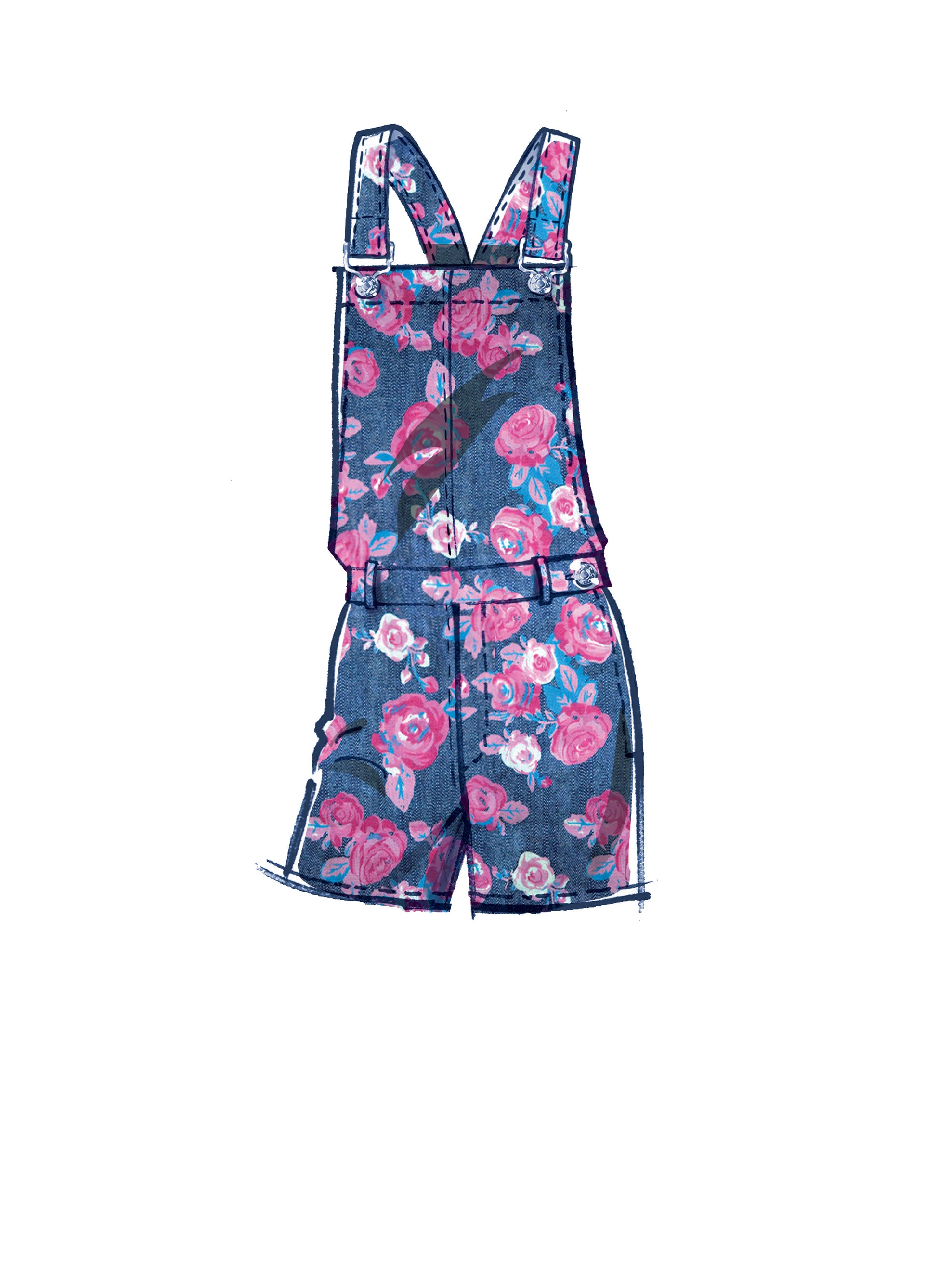Close-fitting jeans & overalls have faux fly front, lapped zipper side opening, patch pocket & leg variations. A, b, c: carriers. C, d: purchased overall buckle kit.