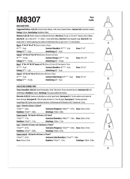 Soft, casual bags and totes have contrast handles and inside pocket. View A has a drawstring closure, view B has inside ties, view C has magnetic closure, and view D has a decorative tassel closure.