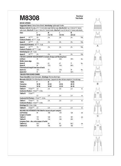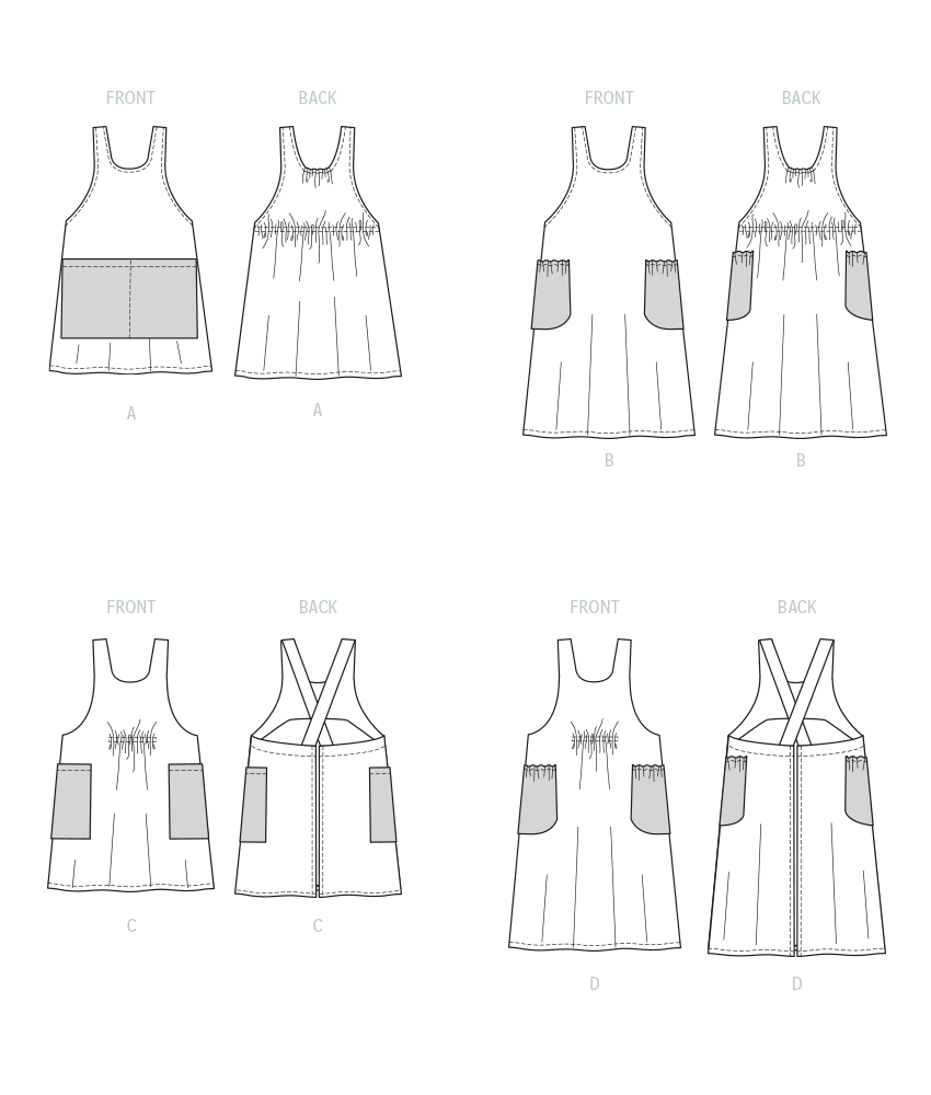 Views A and B have contrast side and front pockets with back elastic. Views C and D have contrast side pockets, elastic at the front waist and crossed shoulder straps in the back.