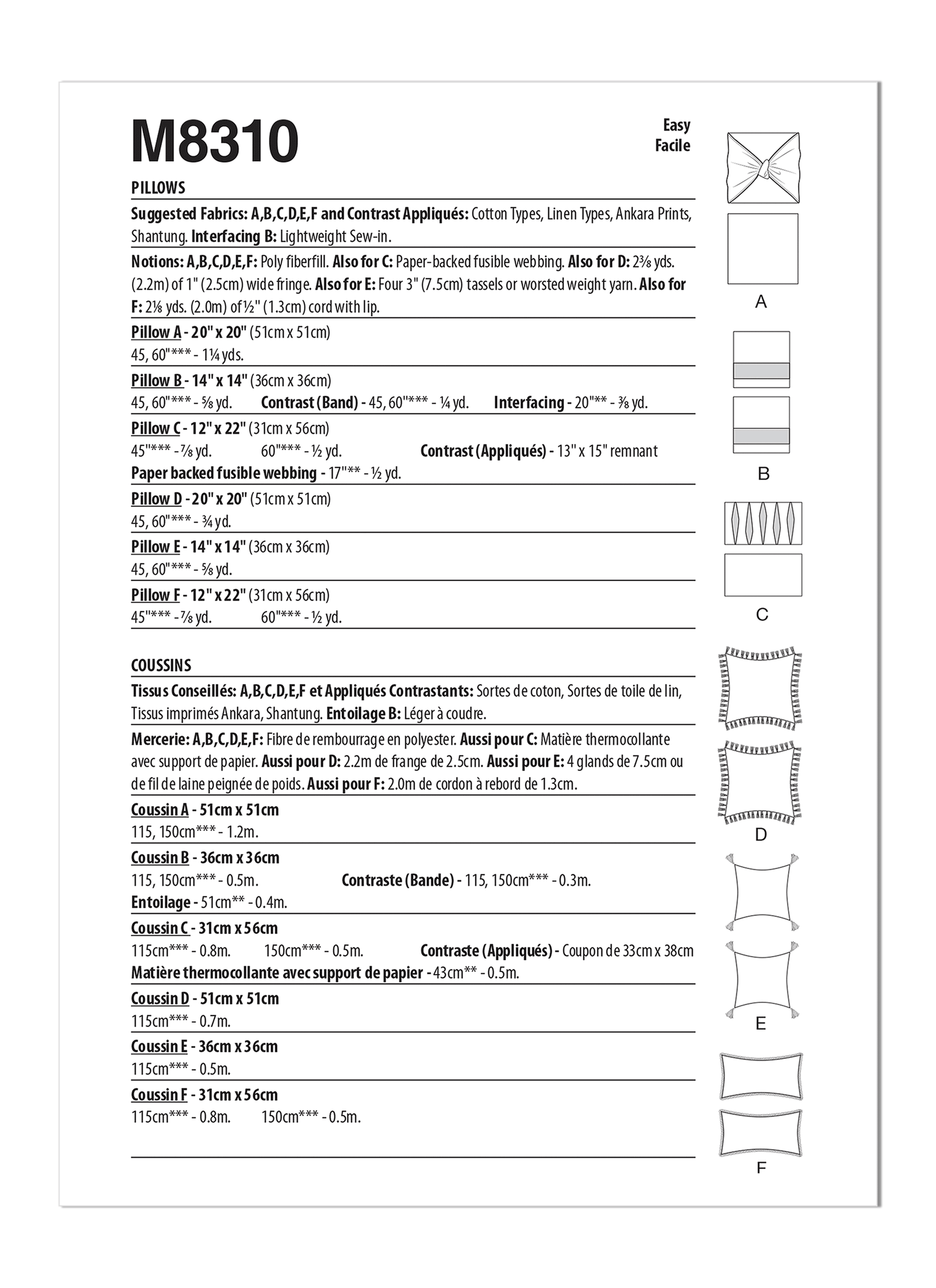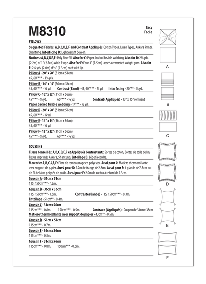 Easy pillows come in three sizes, perfect for bold prints. Large square pillow has knotted overlay; small square and lumbar pillow have contrast band or geometric appliques. Shaped pillows are accented with tassel fringe, handmade or purchased tassels and corded edge.