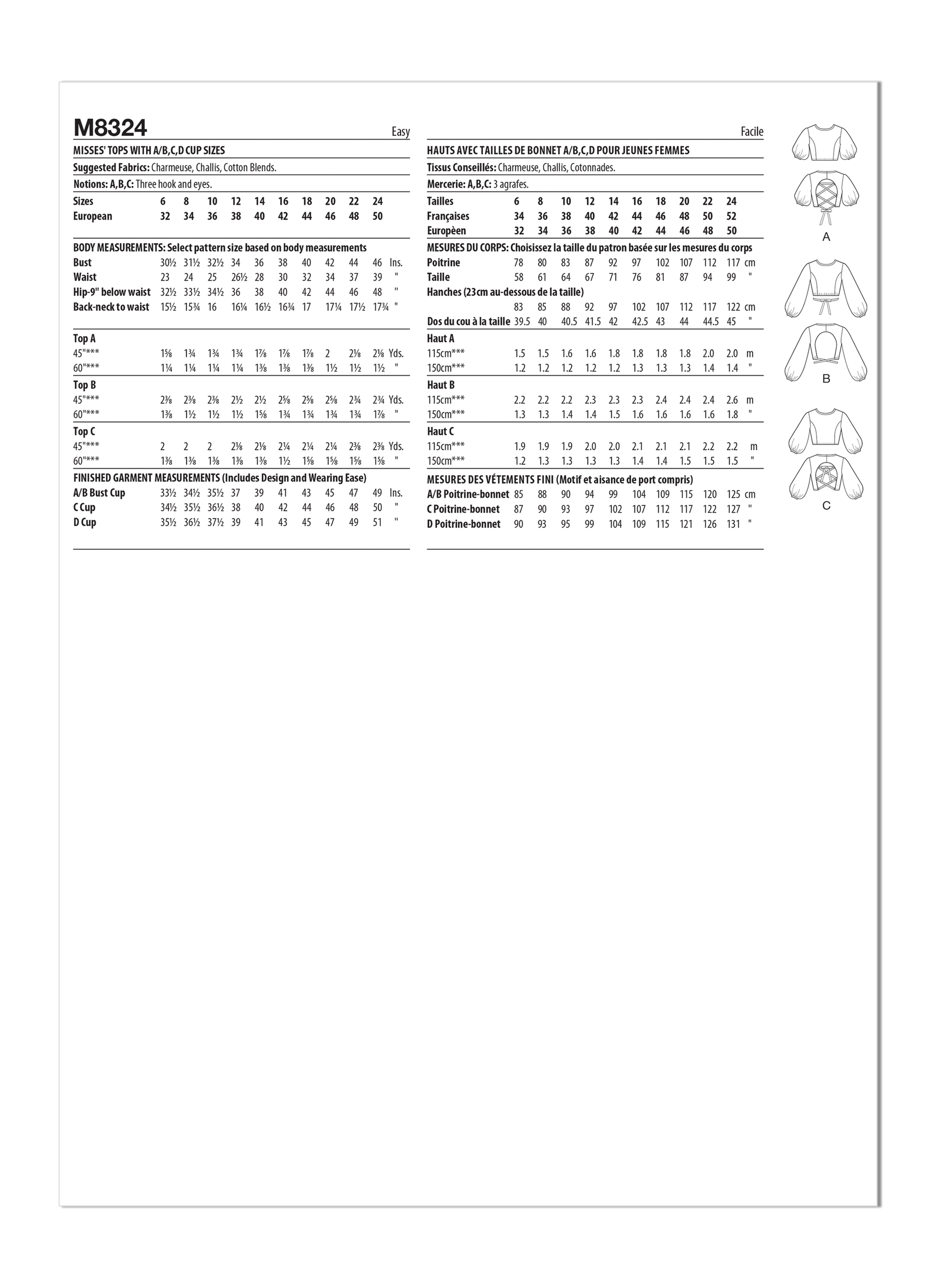 Open back crop tops have short, three-quarter and long sleeves, and hook and eye back opening. View A has lacing back. View B ties back. View C has criss-cross back ties to front. Separate pattern pieces for A/B, C, D cup sizes.