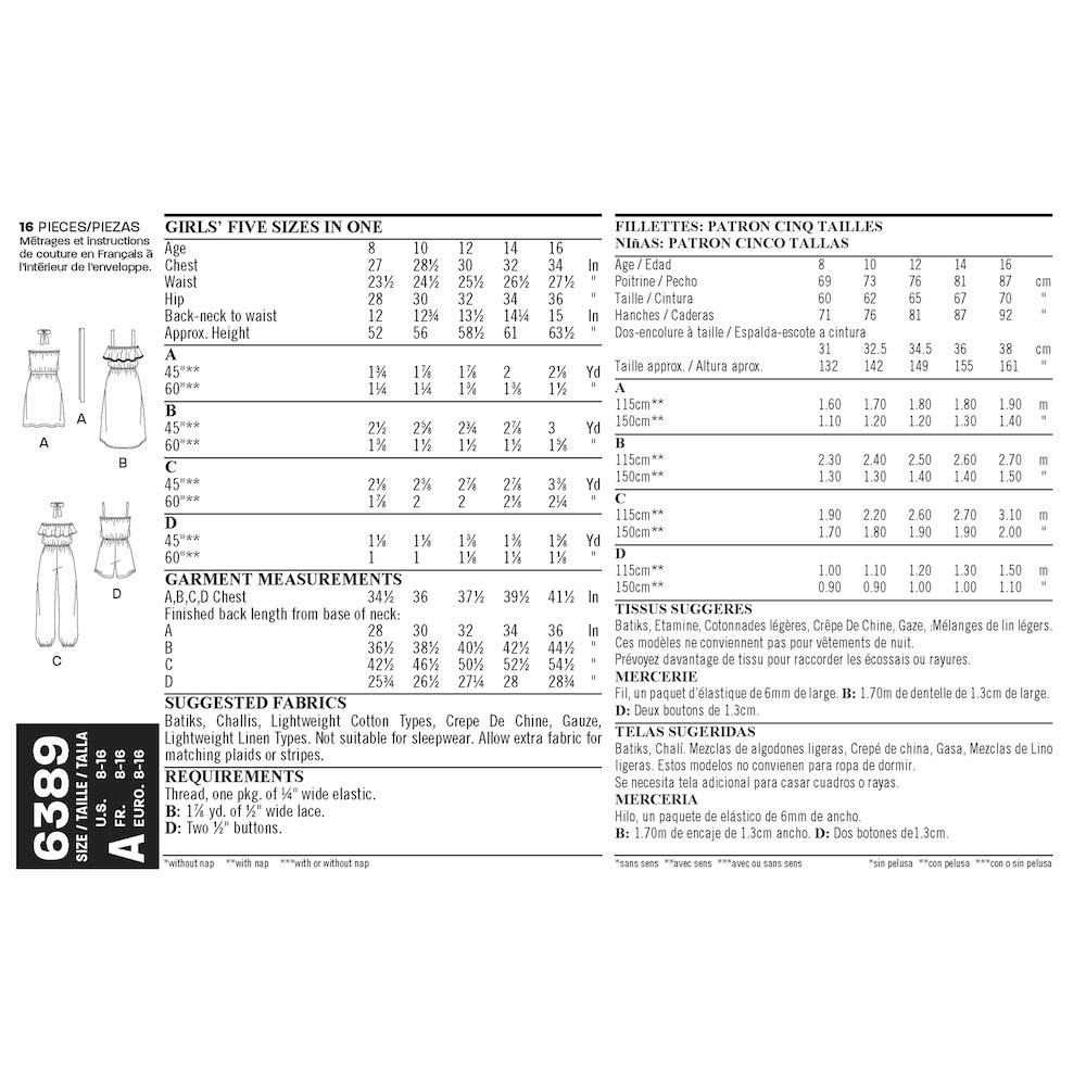 - Girls' pattern includes pull-on jumpsuit, romper, short dress, and high-low dress each with elastic waist.