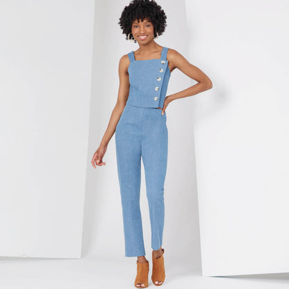 Misses' close-fitting top, skirt and pants. Top and slim skirt button at side front. Pants have zip closure.