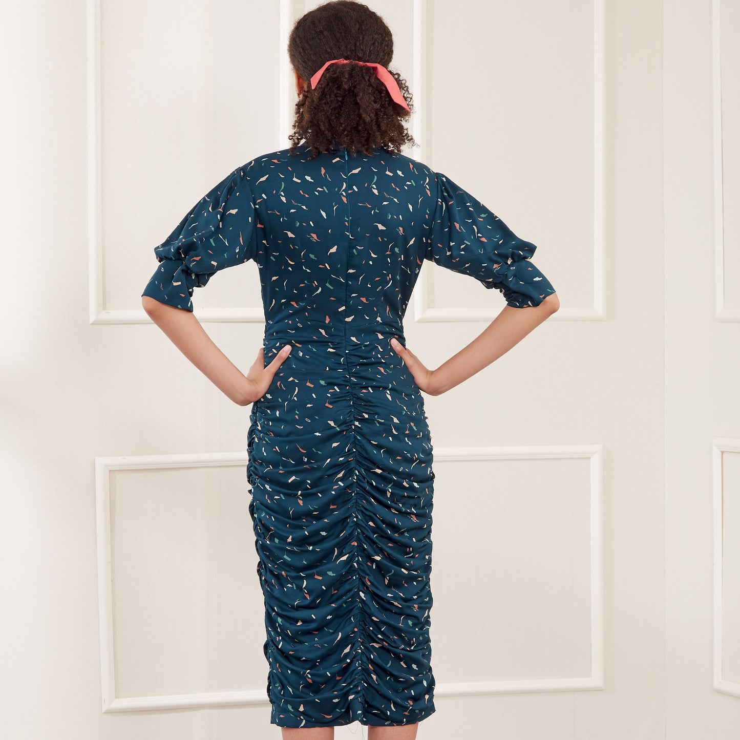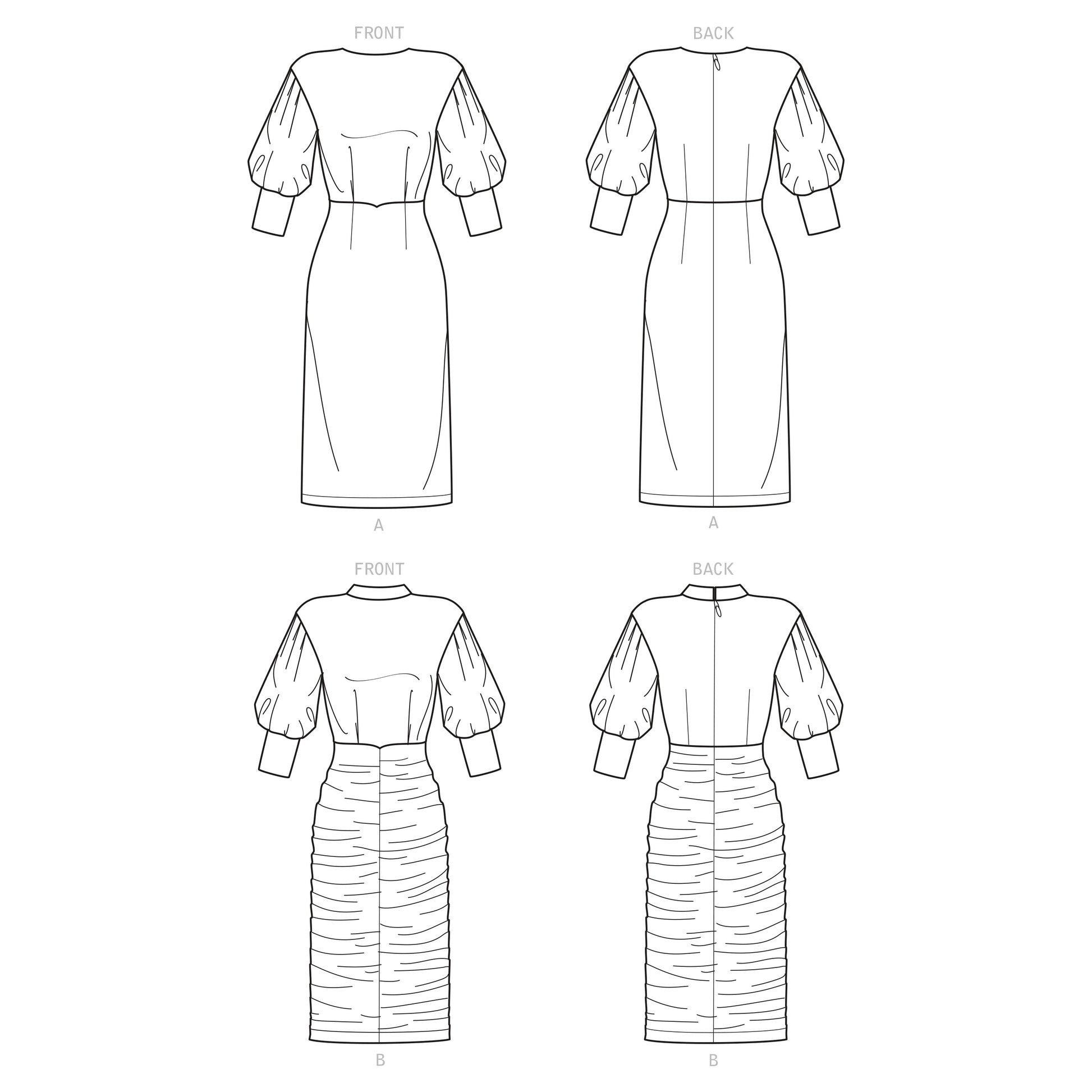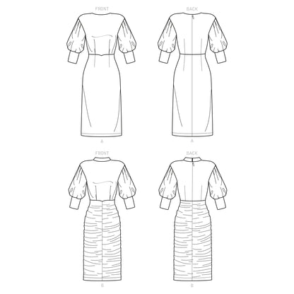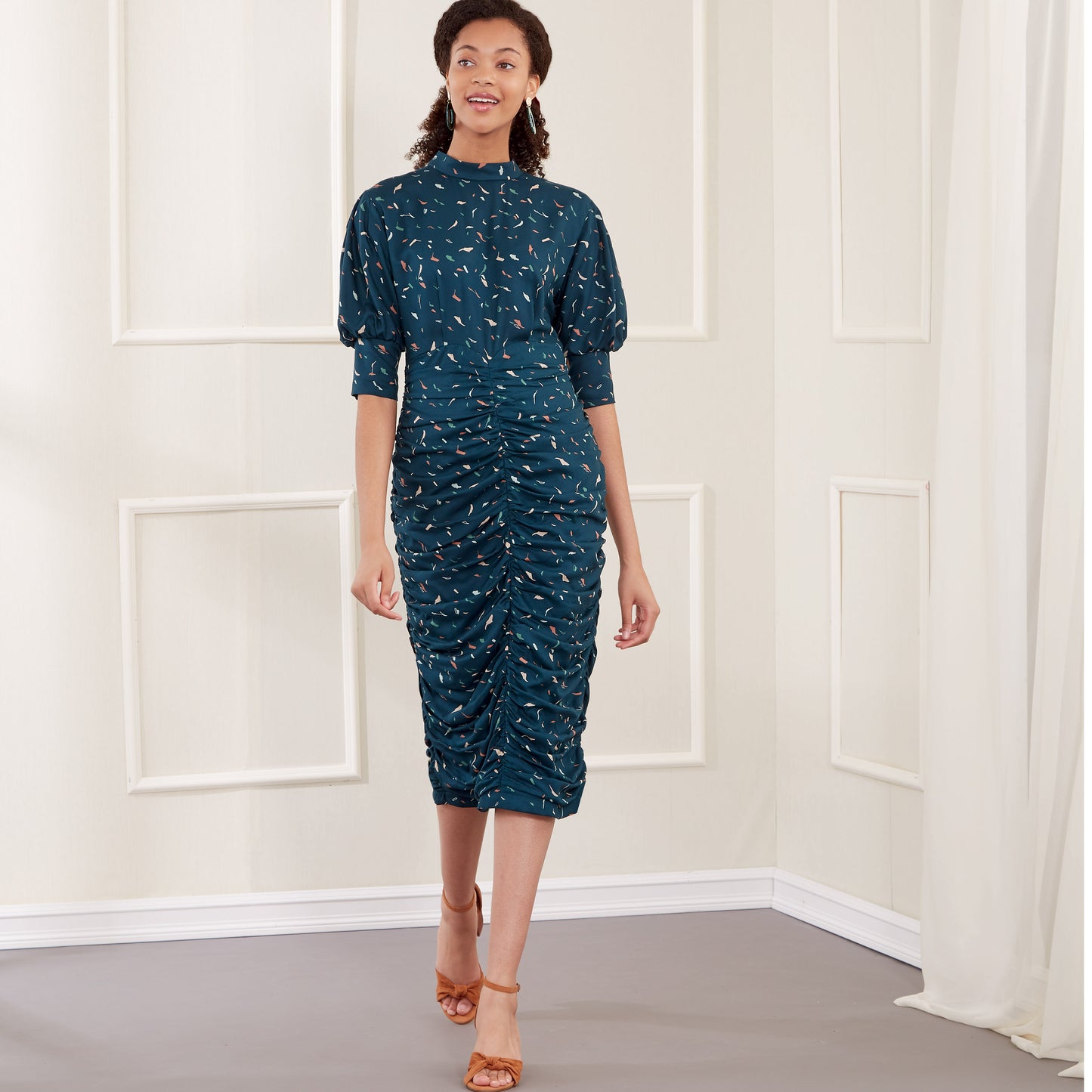 Misses' dress with neckline variations, stylized sleeves & rouching variations.