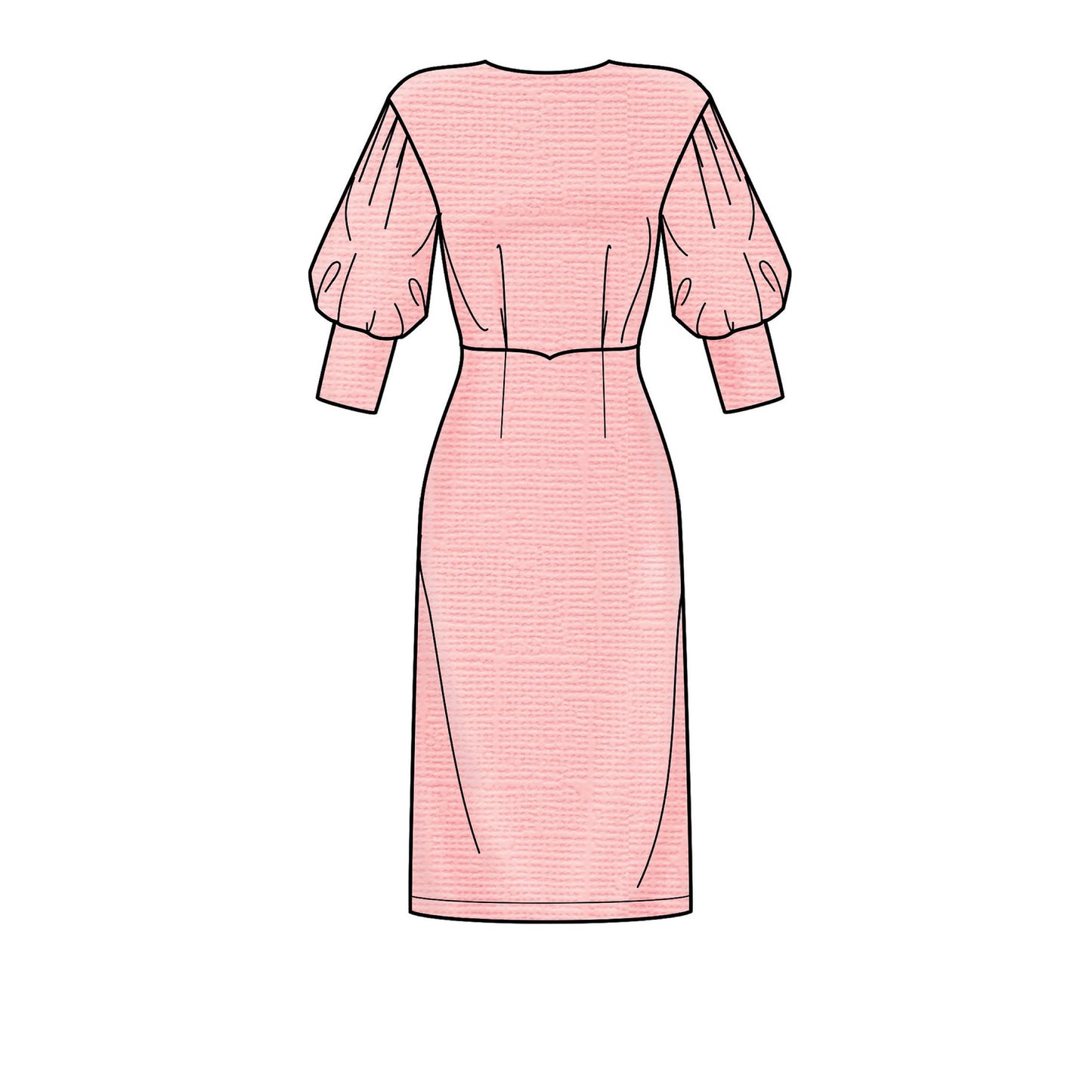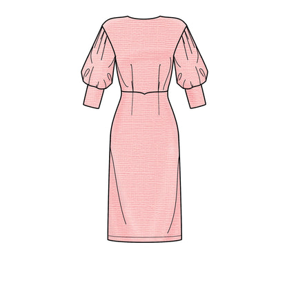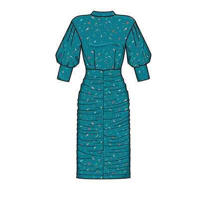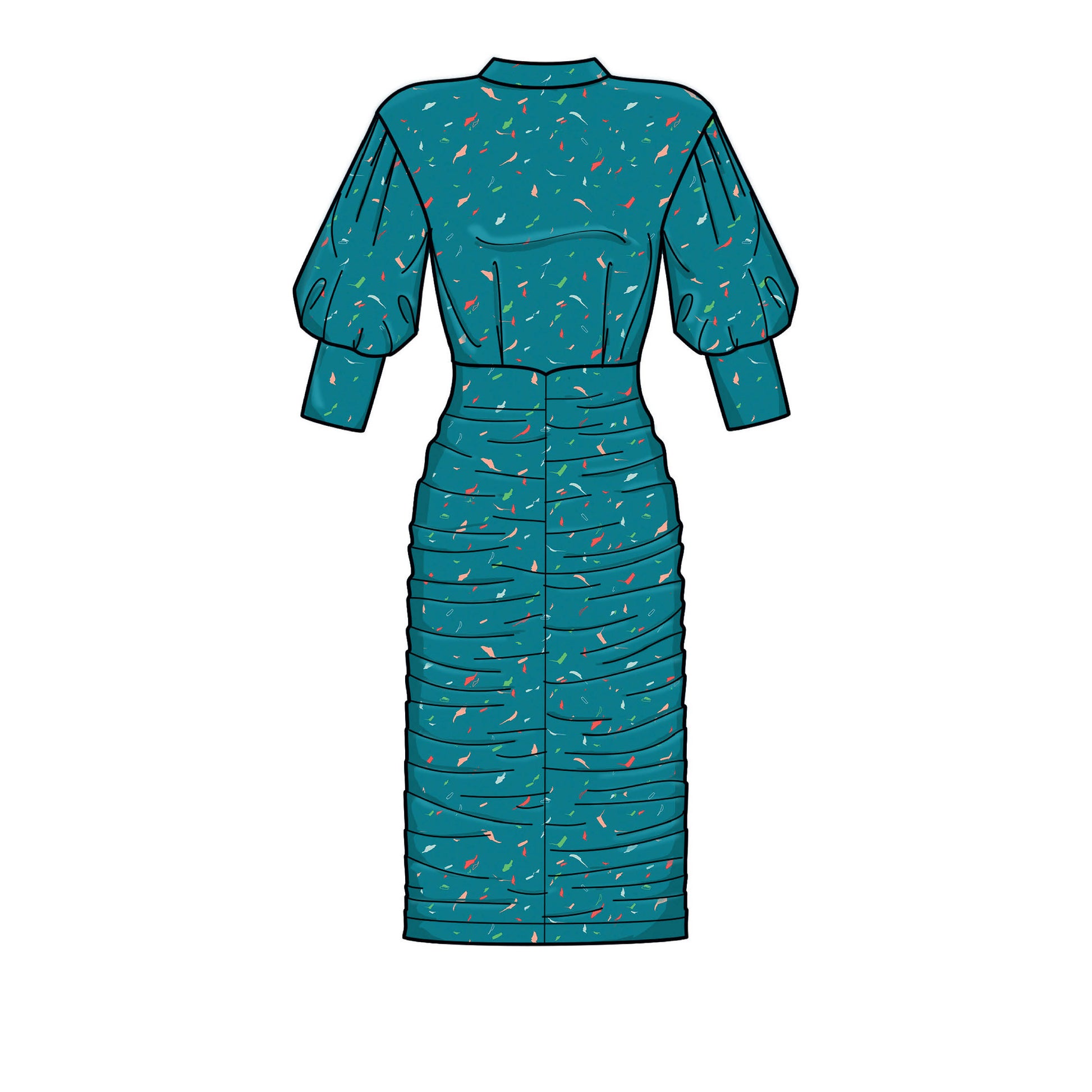 Misses' dress with neckline variations, stylized sleeves & rouching variations.
