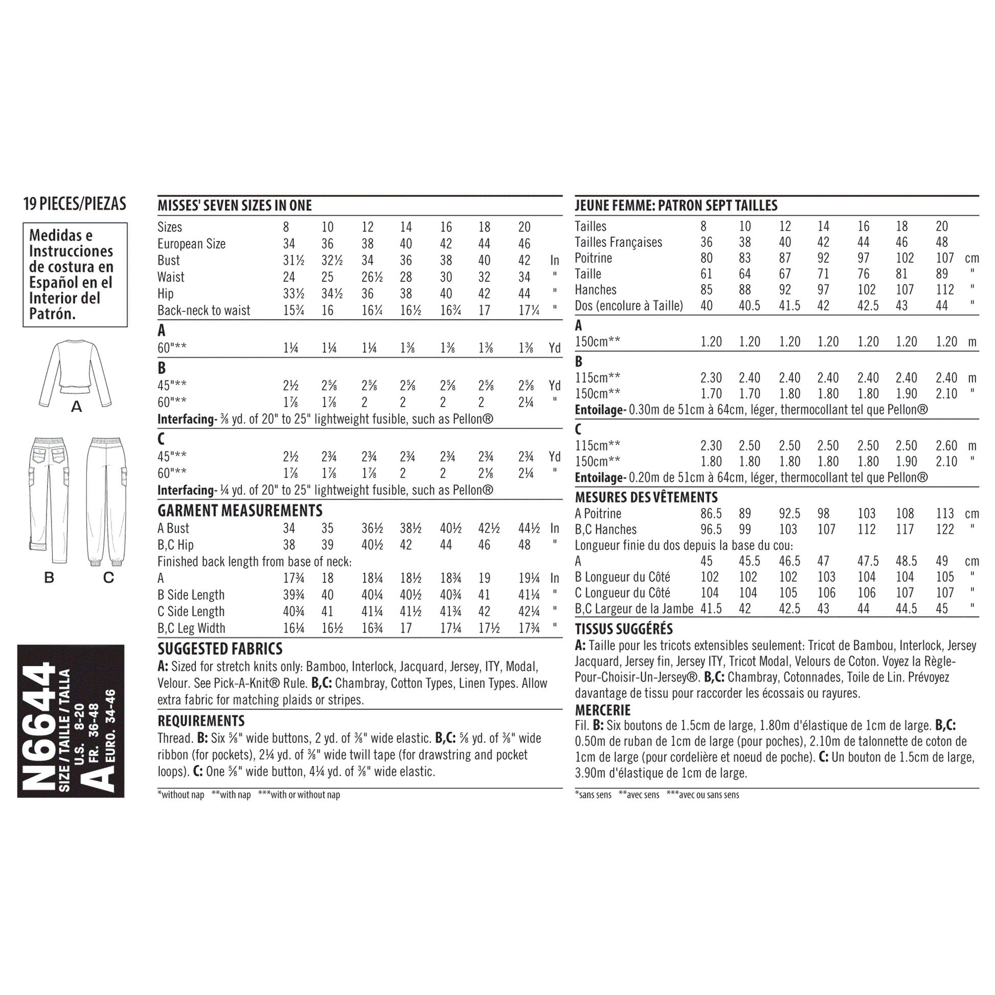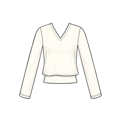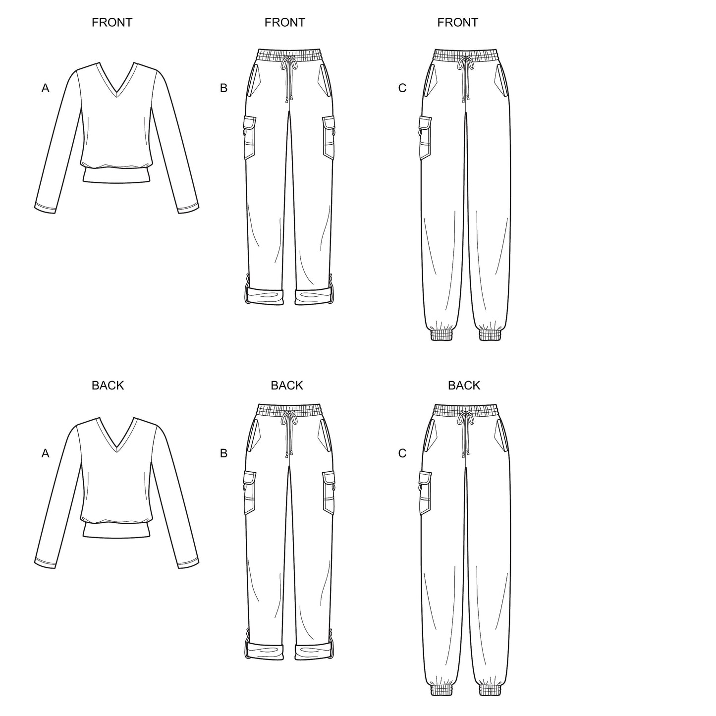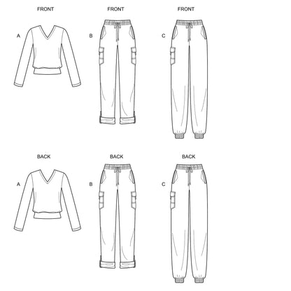 Misses' casual top and pull-on pants. Pull-on v-neck top with long sleeves and waistband, designed for stretch knits only. Pants, designed for woven fabrics, have elasticated waist, cuffed or turn-up tabbed hems. Side-seam and cargo pockets.