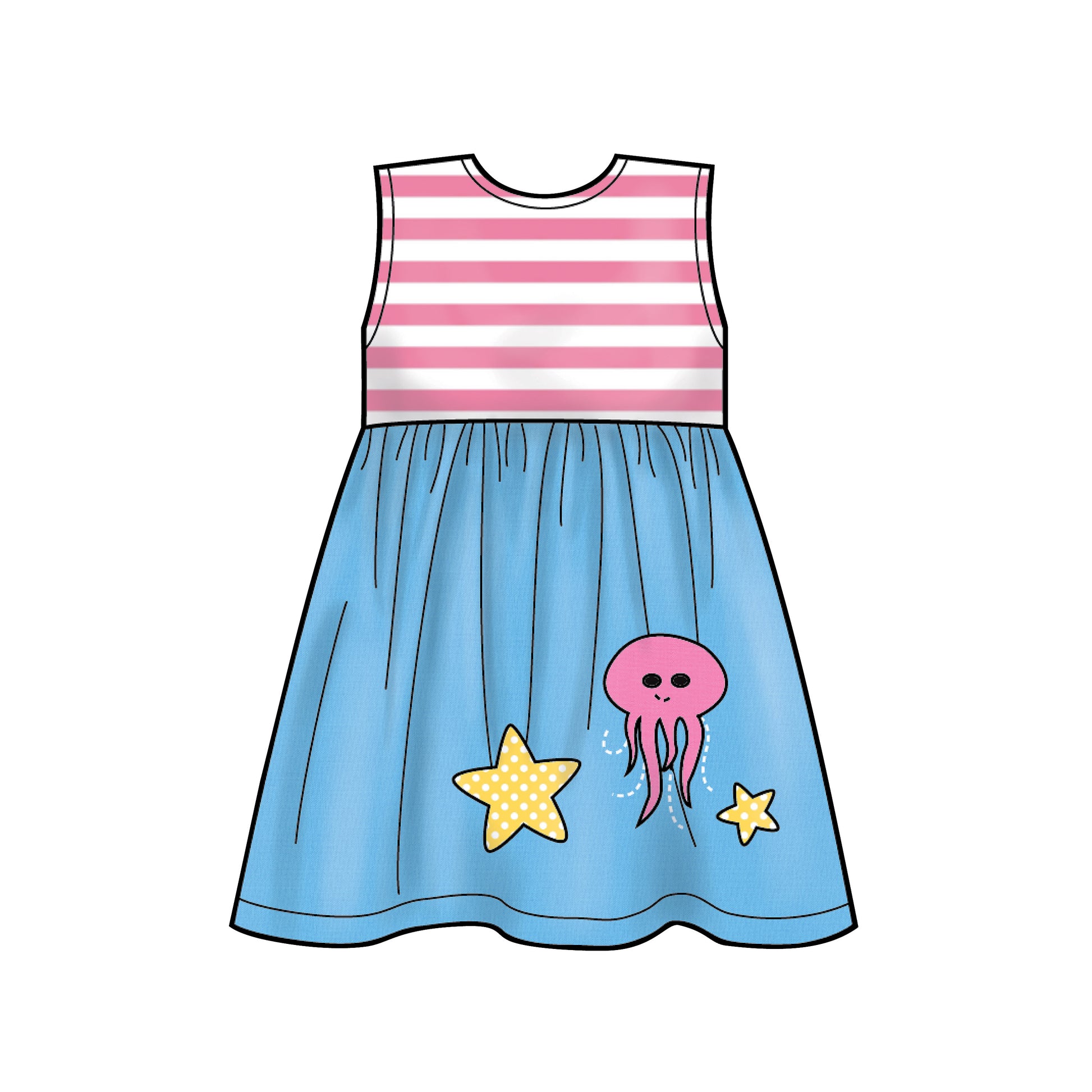 Toddlers' dresses. Skirts gathered into raised waistline. Sleeveless, short or long sleeve variations. Zip fastens at back. Swans, Lady-bug and leaf, Jellyfish and Starfish Applique options.