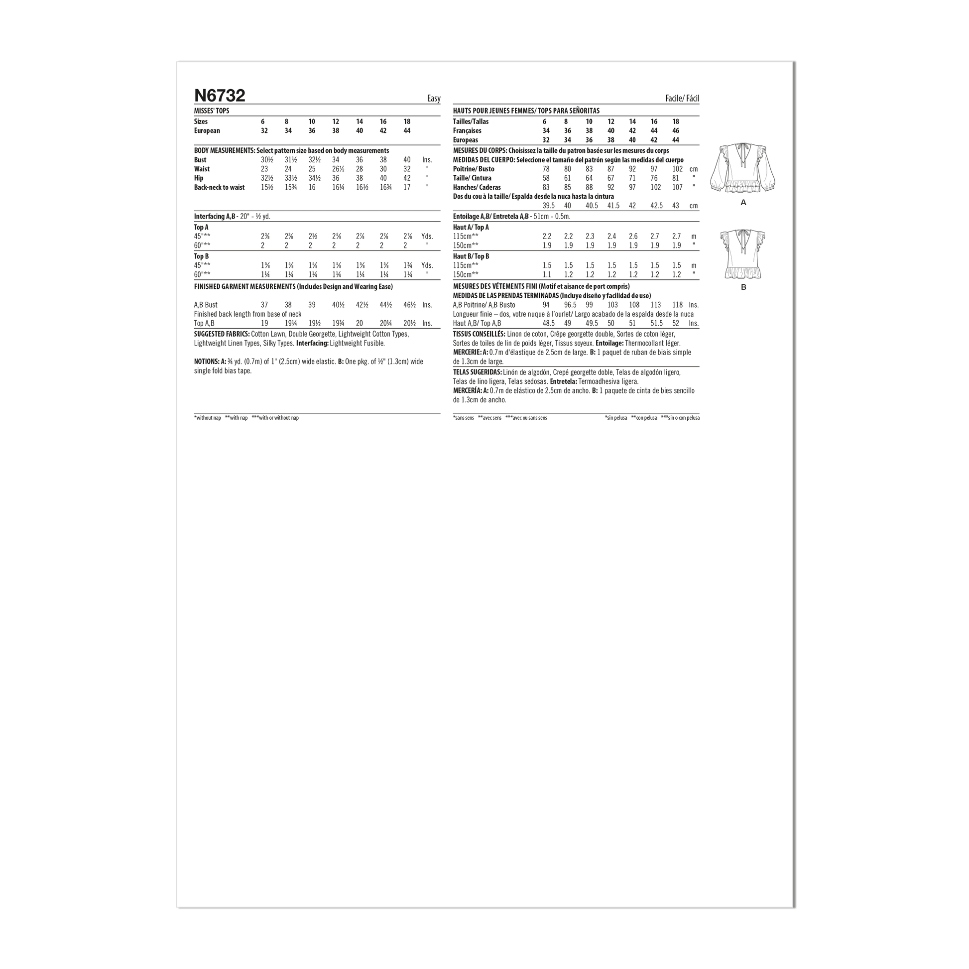 Pullover tops with round neck and raised waist have three-quarter puffed sleeves or are sleeveless. Includes ruffle details and V-shaped back interest with ties.