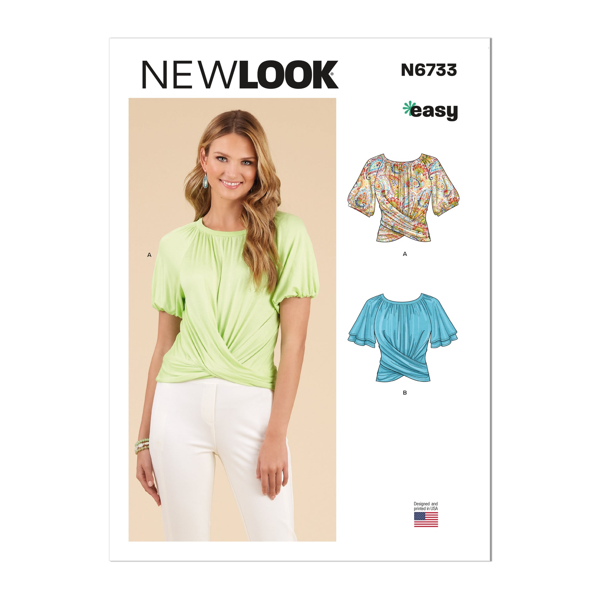Misses' over-the-head knit tops with wrap effect have round banded necks, puffed or flutter sleeves and ties in the back.