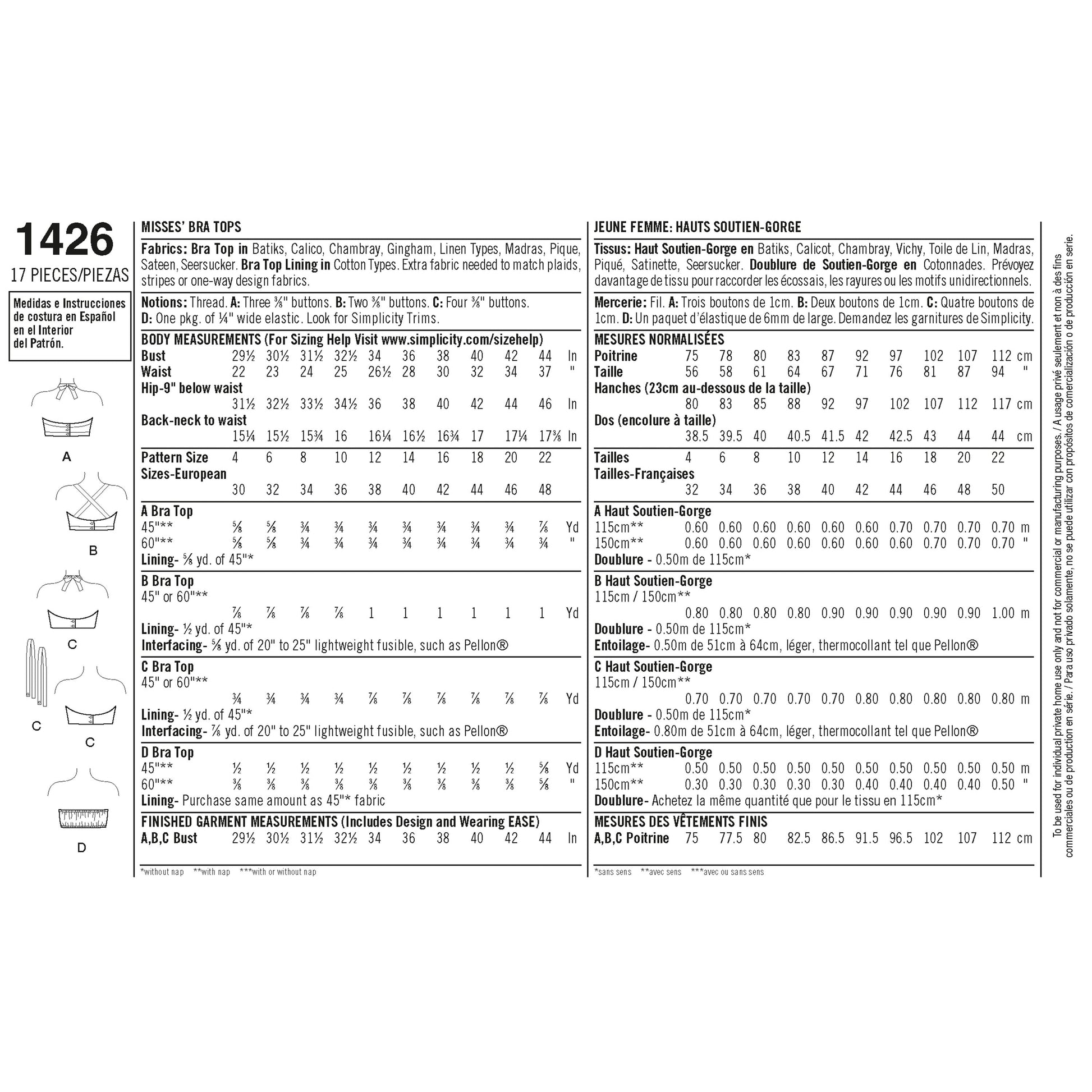 Simplicity Pattern 1426 Women's Vintage 1950's Bra Tops