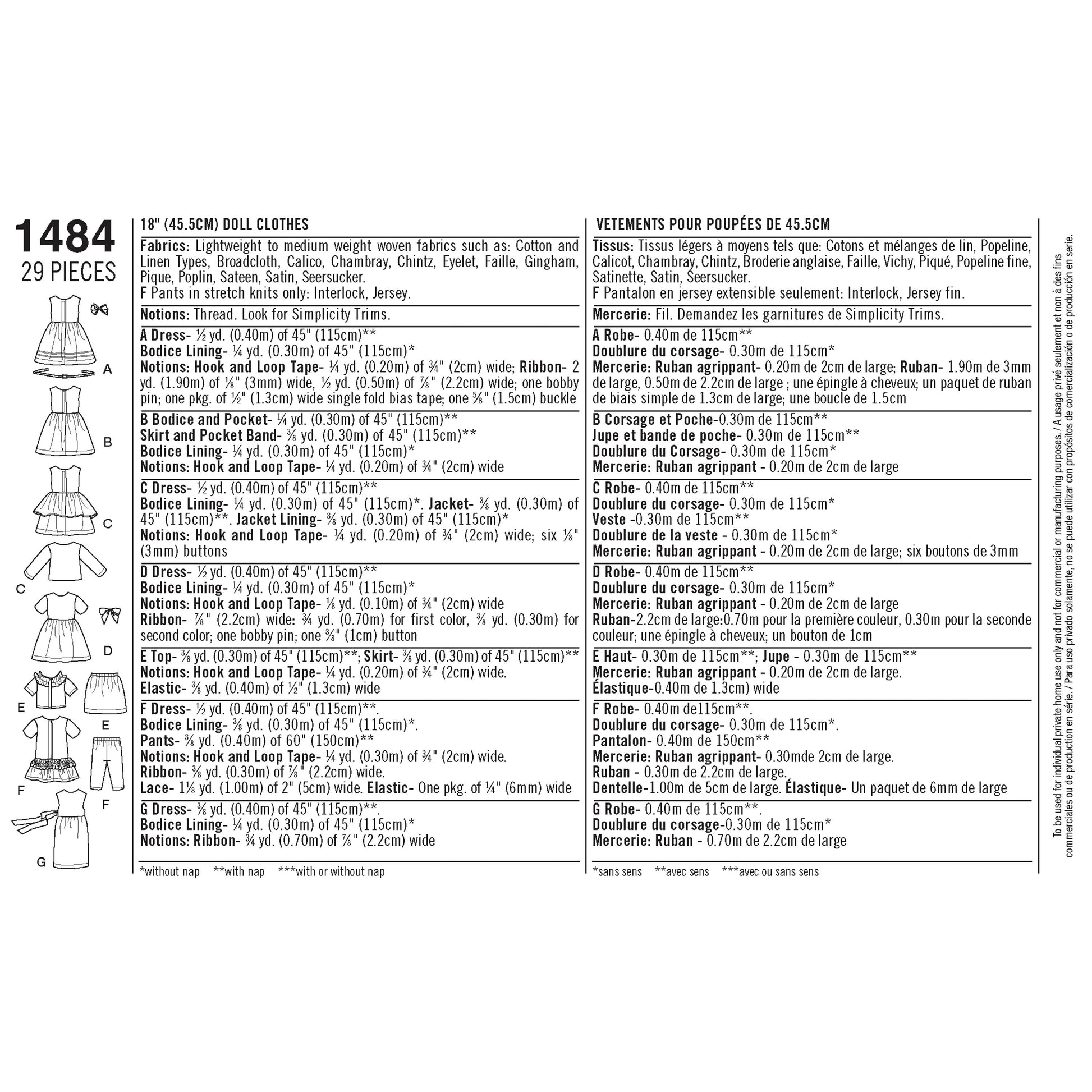 Simplicity Pattern 1484 OS 18" Doll Clothes