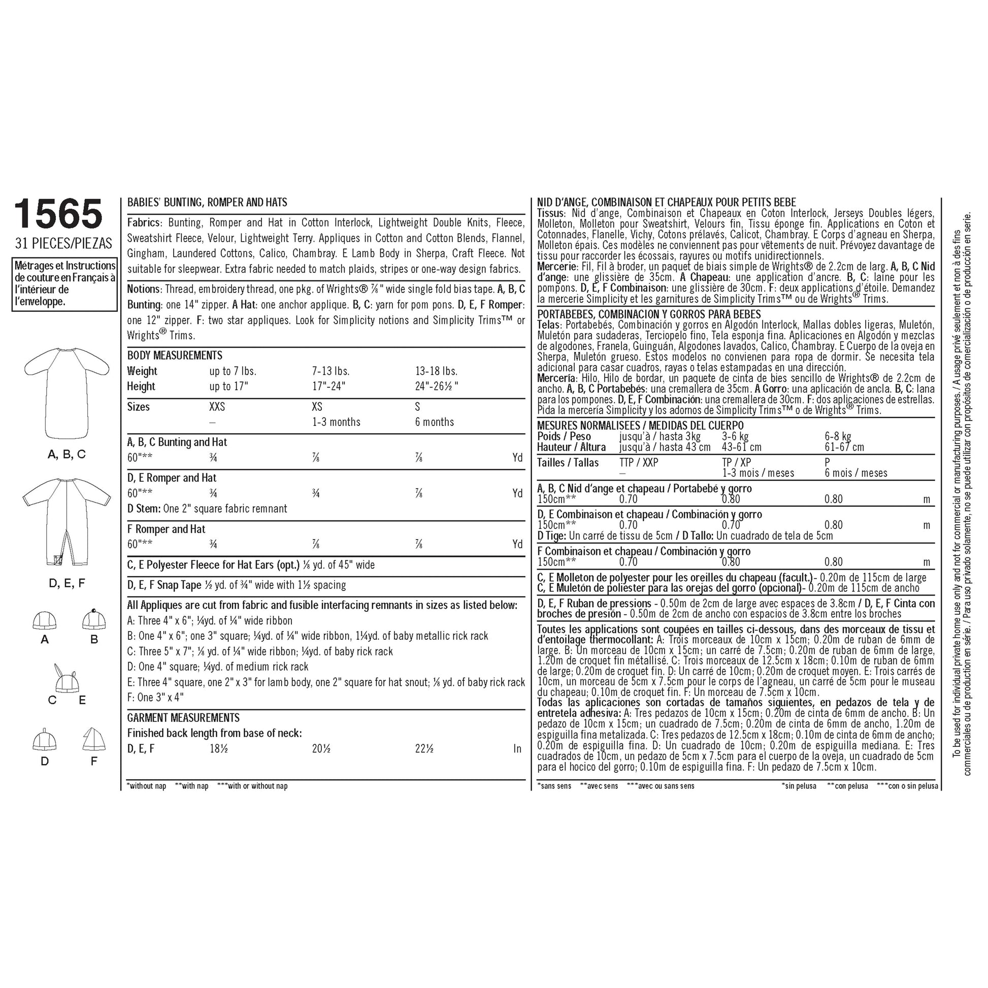 Simplicity Pattern 1565 Babies' Bunting, Romper and Hats