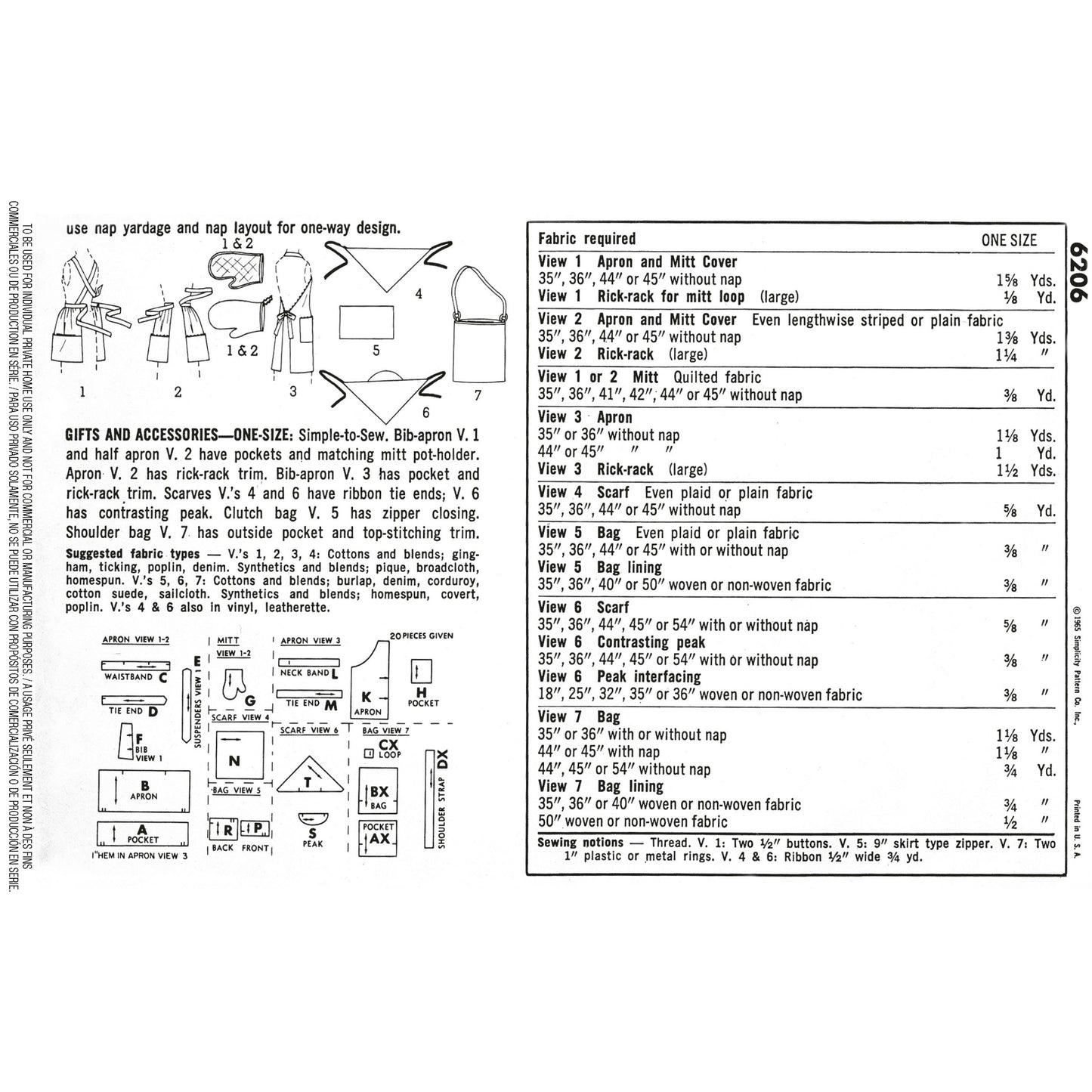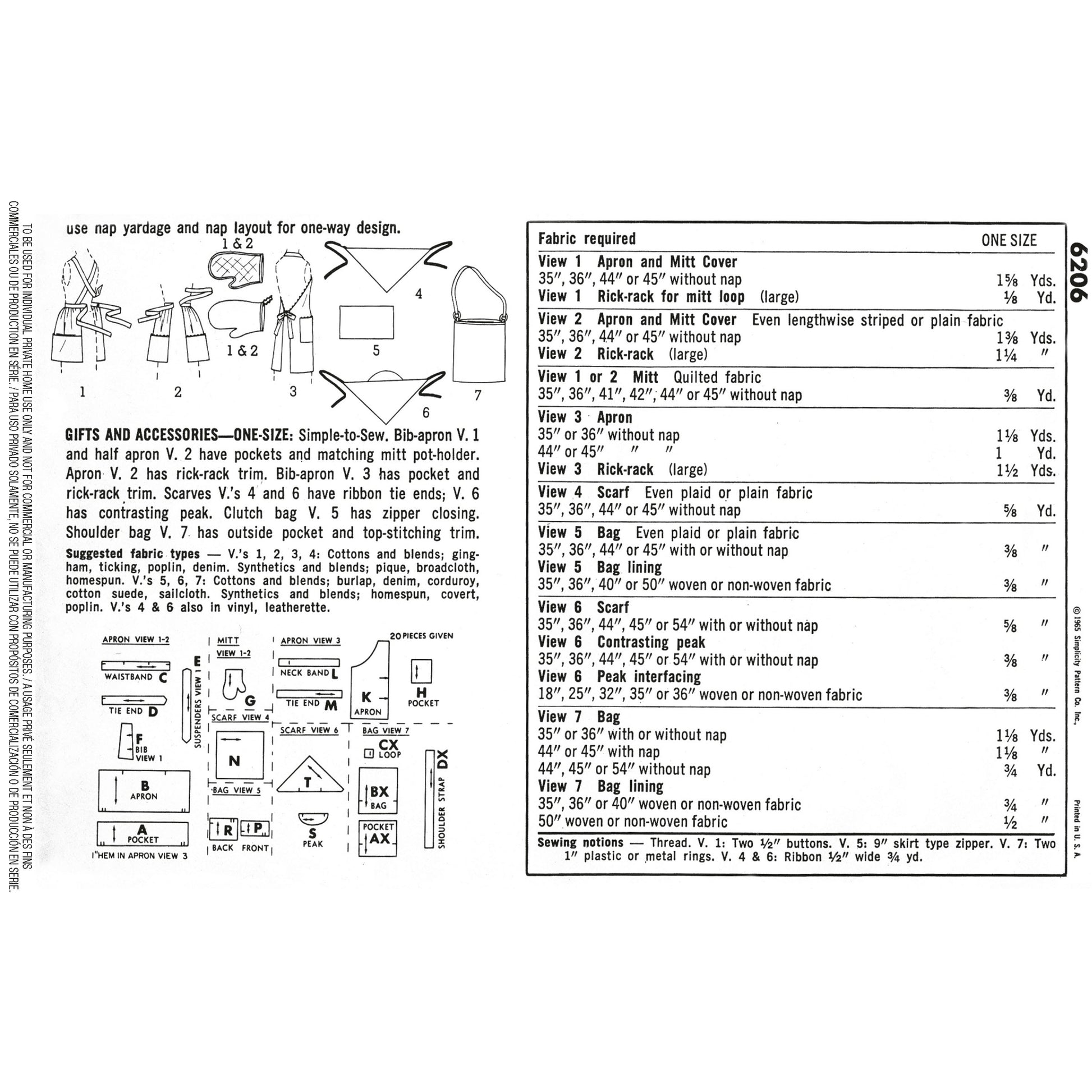 Simple to make. Bib-apron V.1 and half apron V.2 have pockets and matching mitt pot holder. Apron V.2 has rick-rack trim. Bib-apron V.3 has pocket and rick-rack trim. Scarves V.'s 4 and 5 have ribbon tie ends; V.6 has contrasting peak. Clutch bag V.5 has zipper closing. Shoulder bag V.7 has outside pocket and top-stitching trim. Simplicity Vintage original copy sewing pattern.