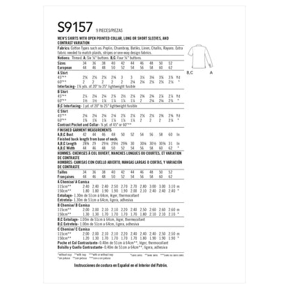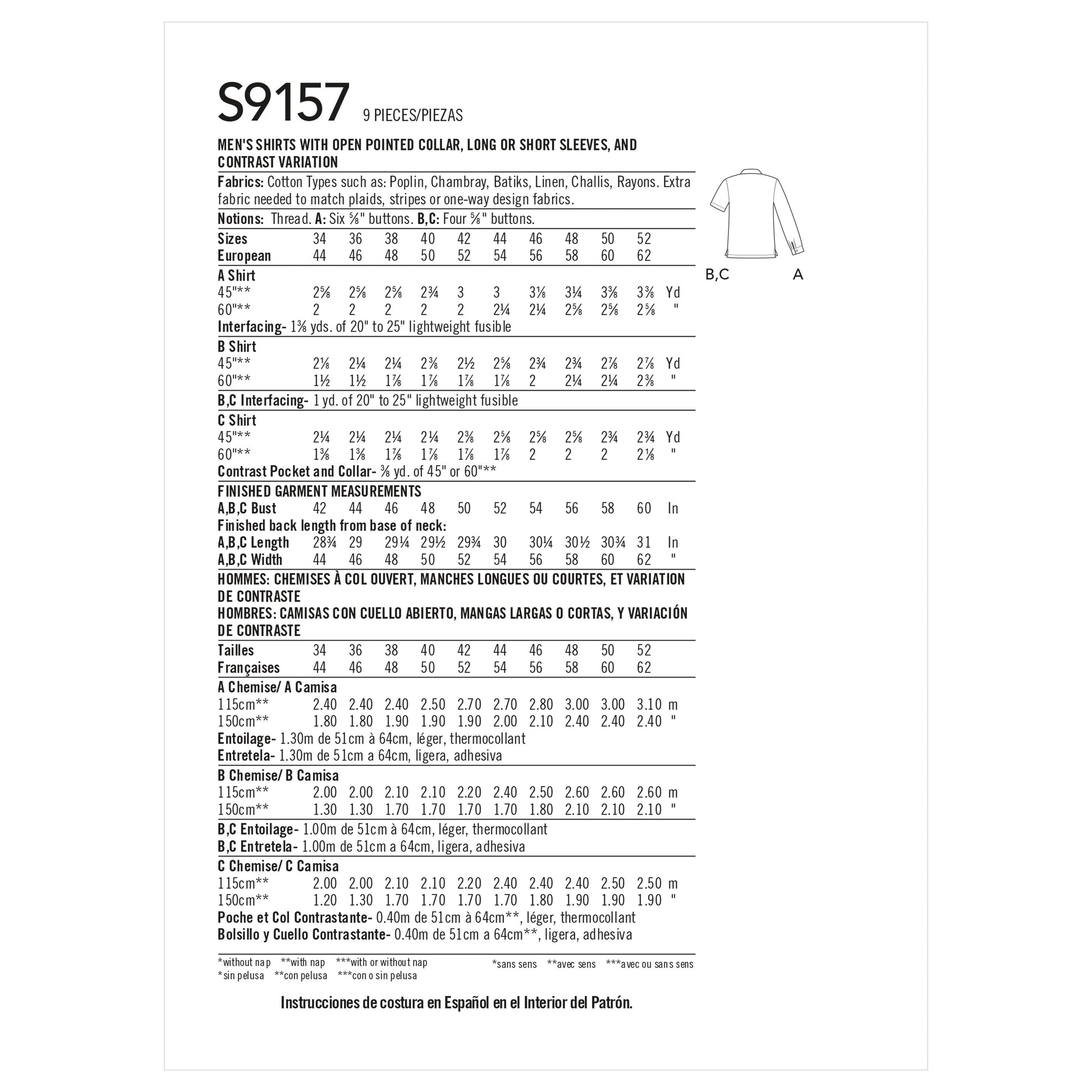 Simplicity Sewing Pattern SS9157AA (34-36-38-40-42) men, Men's shirts with open pointed collar, long or short sleeves, & contrast variation