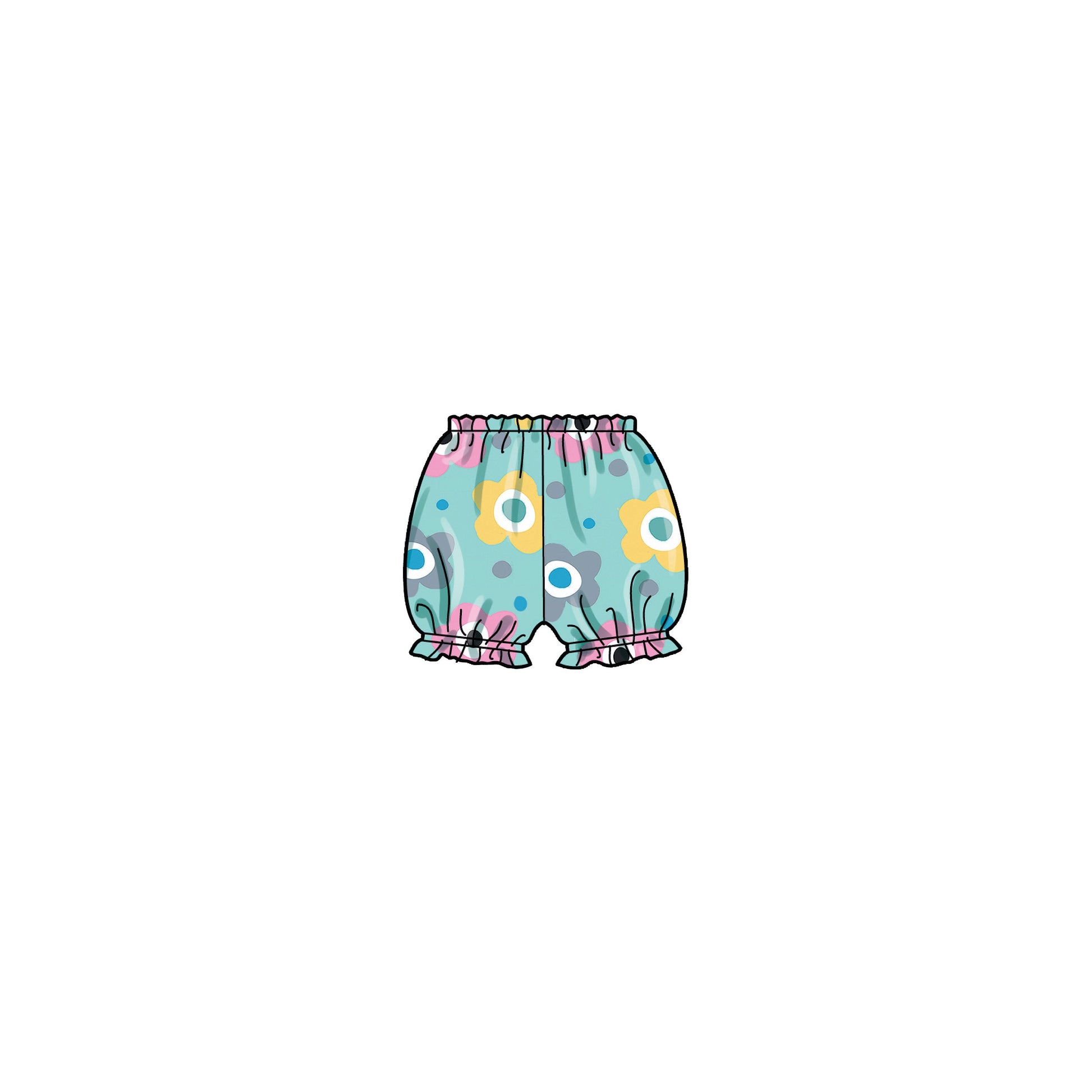 Simplicity SS9319CAA TODDLER SPORTSWEAR Pullover top and dresses have self-lined bodice, raised waist, gathers, adjustable, concealed criss-cross back button shoulder straps and narrow hem. A, B, C: ruffles. A, B, C (optional), D: bows and knots. D, E: snap tape closing. Purchased optional appliqués C and trim E. Bloomers have elastic waist. D, F: elasticized leg openings.