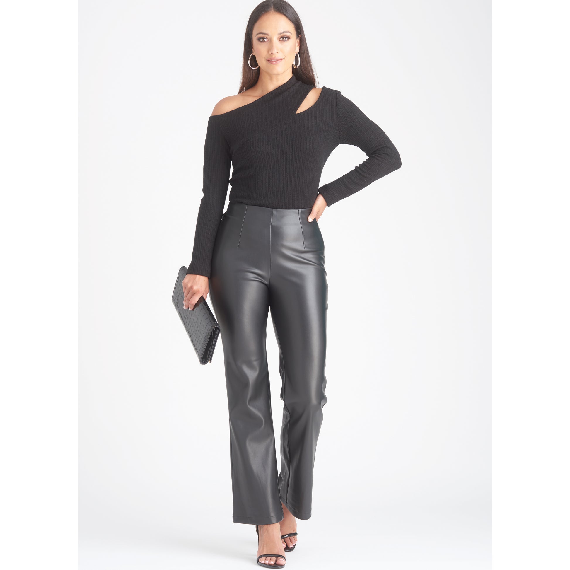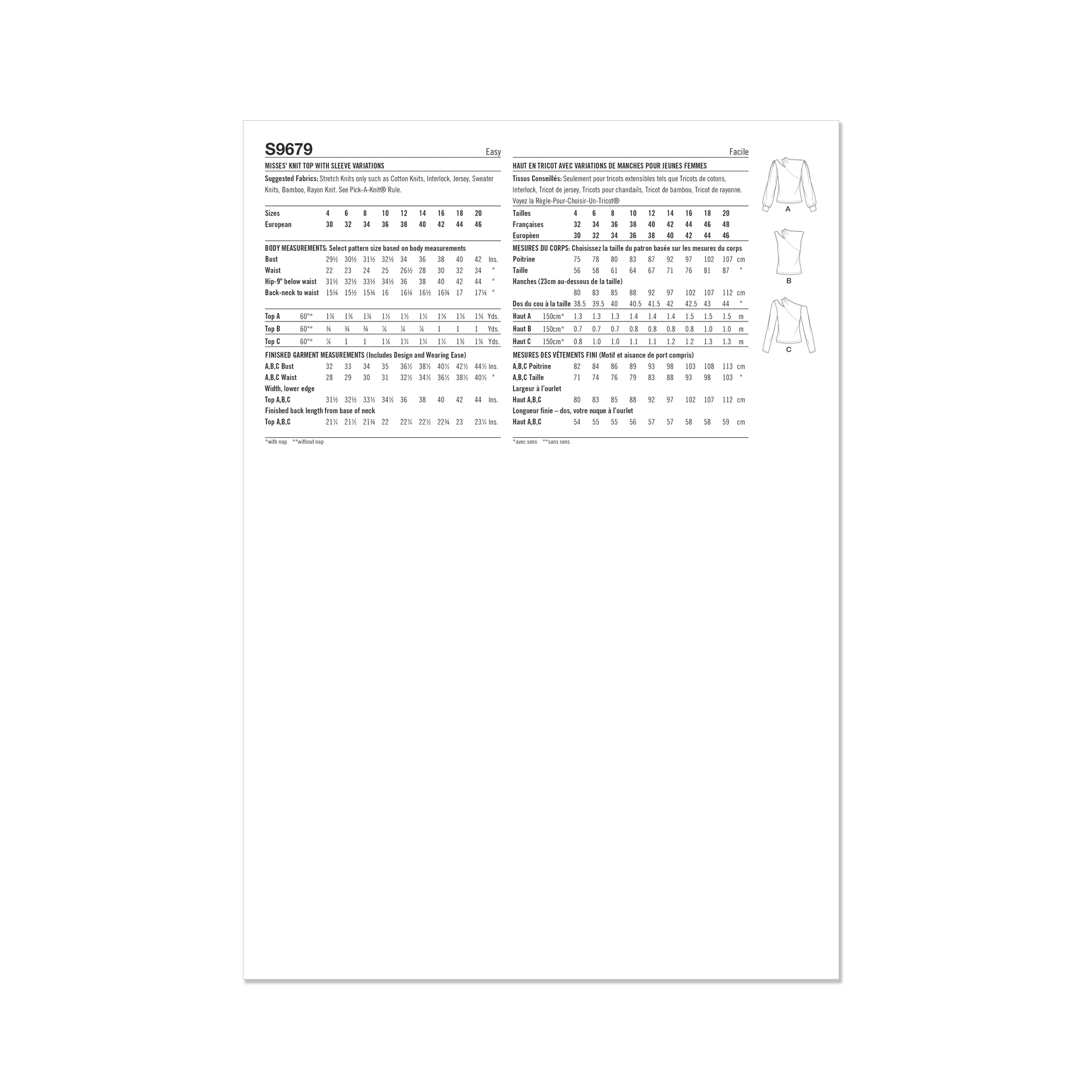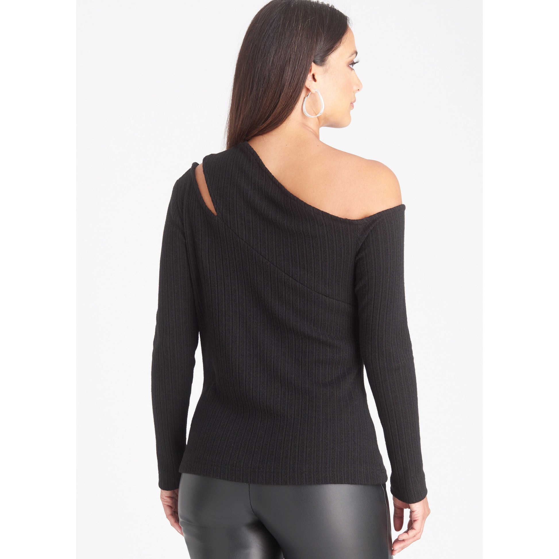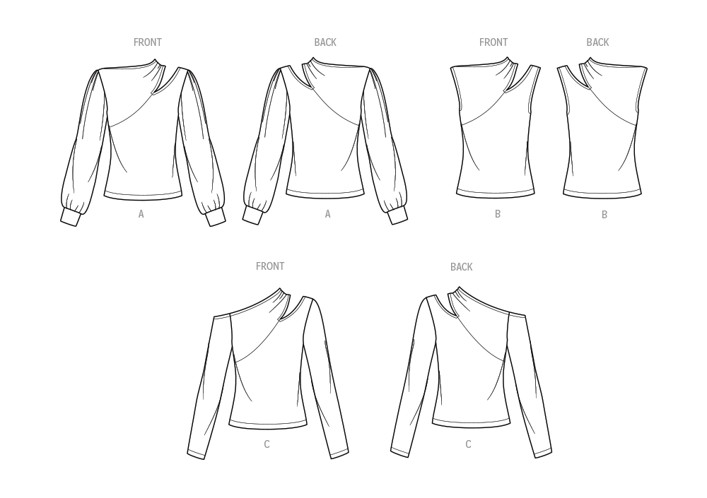 Knit tops have asymmetric cut-out along the shoulder for a sleek silhouette look. Top features long gathered sleeves with bands, long straight sleeves and sleeveless option.