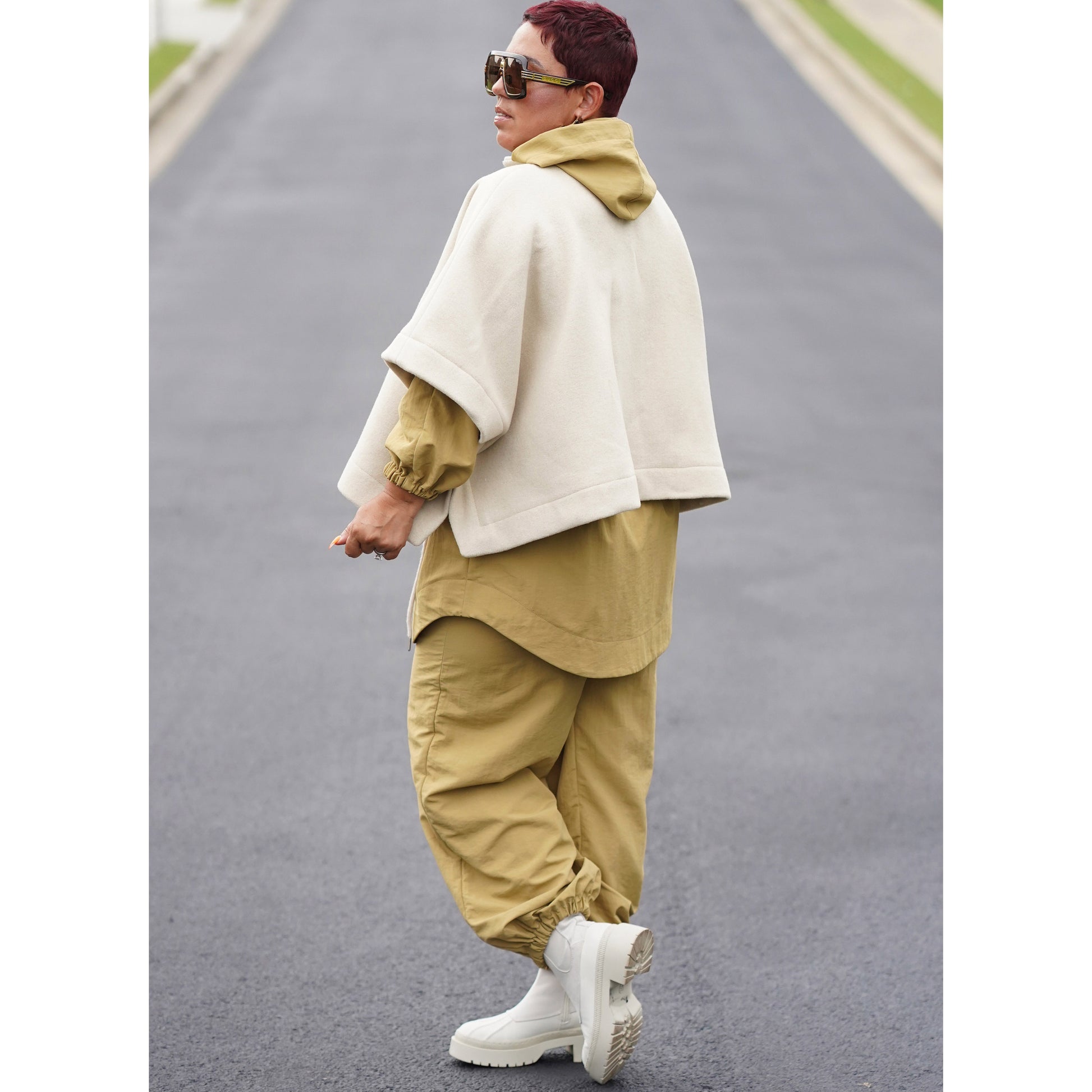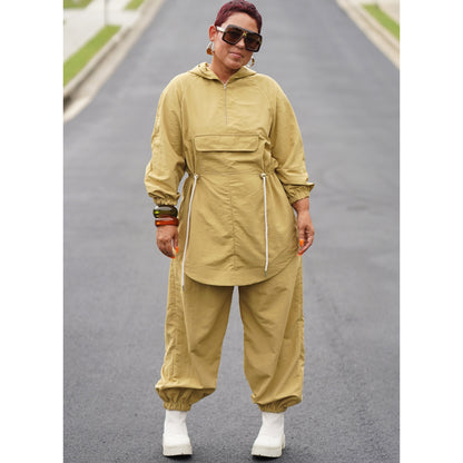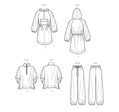 Anorak style jacket with hood features front cargo pocket, half front zipper, elastic waist cording, and elastic at sleeves. View B is a poncho that includes half zip front and snap fasteners under sleeves. View C are pants with drawstring ties and elasticized cuffs.