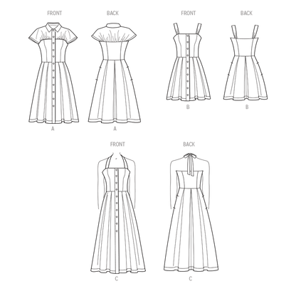 Button front dresses in three lengths have princess seams, inverted pleats and side seam pockets. View A dress has collar, yoke and cap sleeves. View B is a short dress with straps. View C is a halter dress that ties in the back.