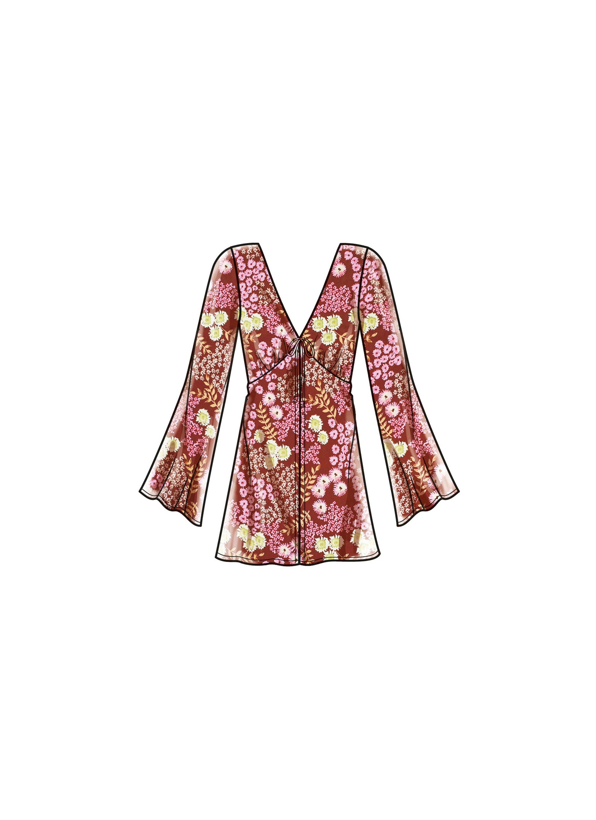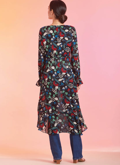 Misses' Dusters in three lengths have a deep V-neckline, lined bodice, tie front closure and bust gathers. View A has self ruffle detail. View A and View B have elastic at sleeves. View C has long flared sleeves.