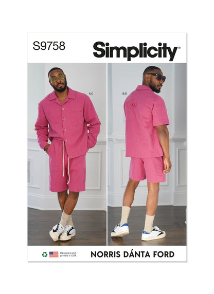 Relaxed fit button front shirts have convertible collar, front pocket, side slits, back yoke and long or short sleeves. Pull-on shorts in two lengths have elastic waistband, drawstring ties and pockets.