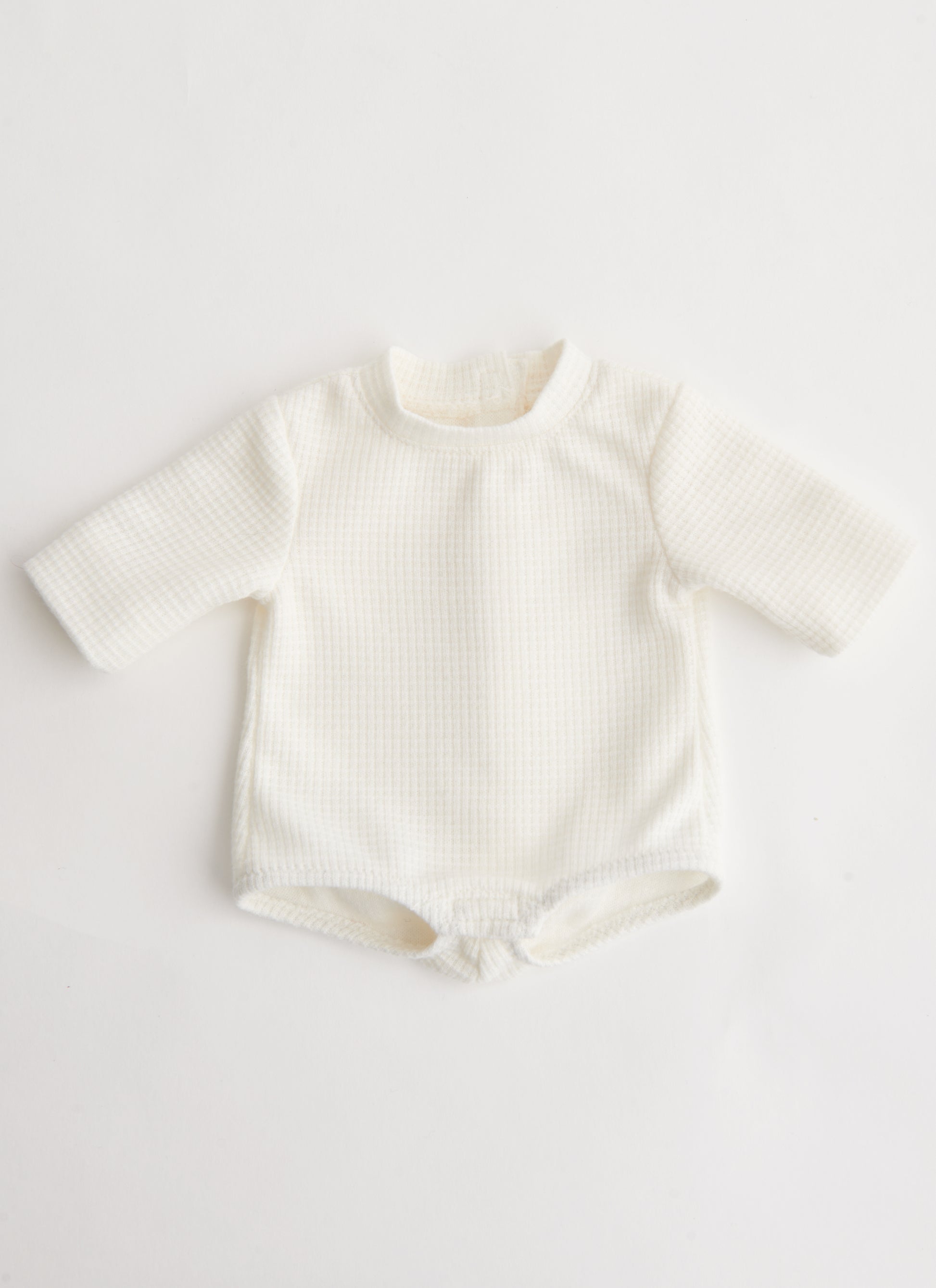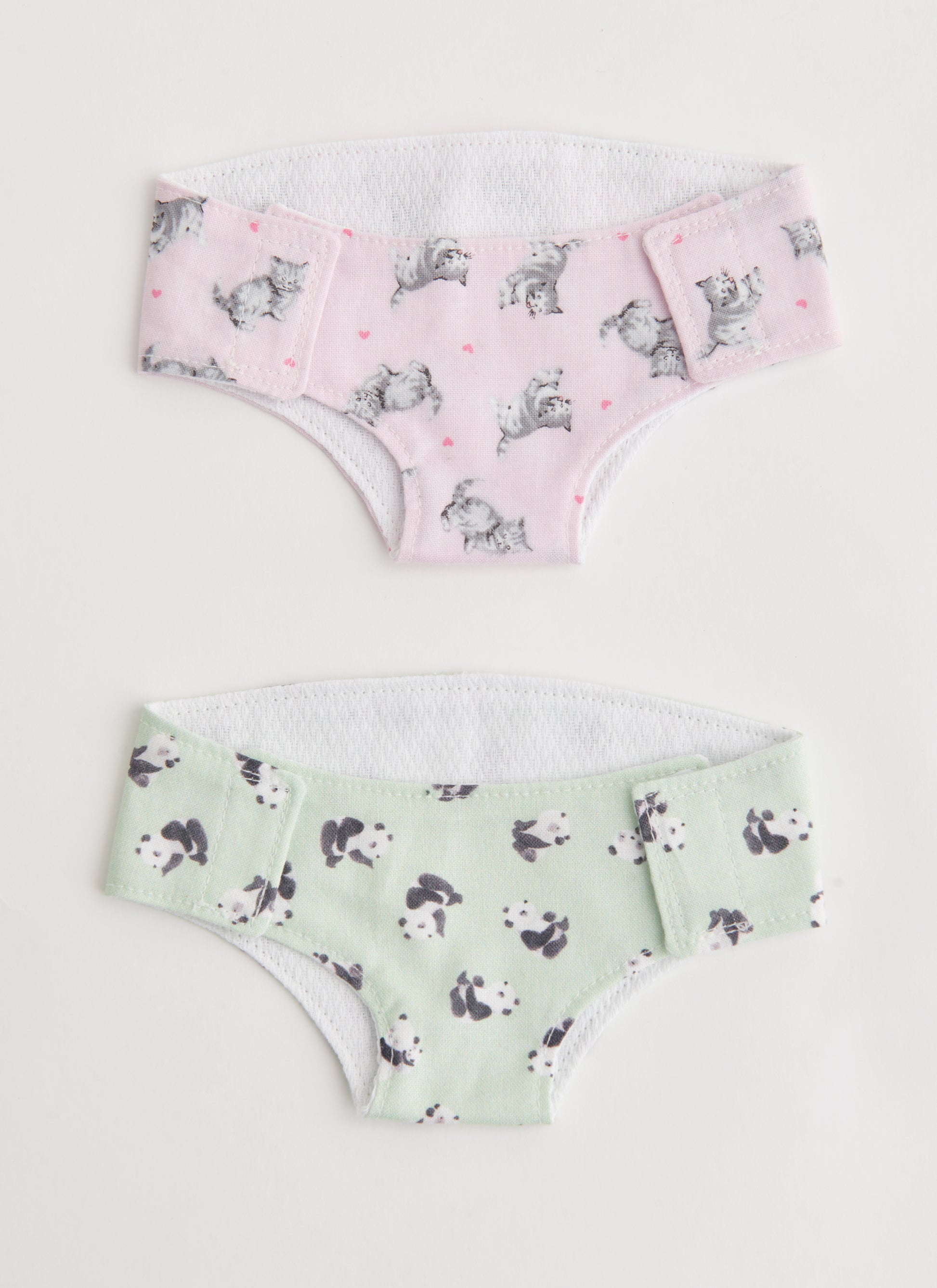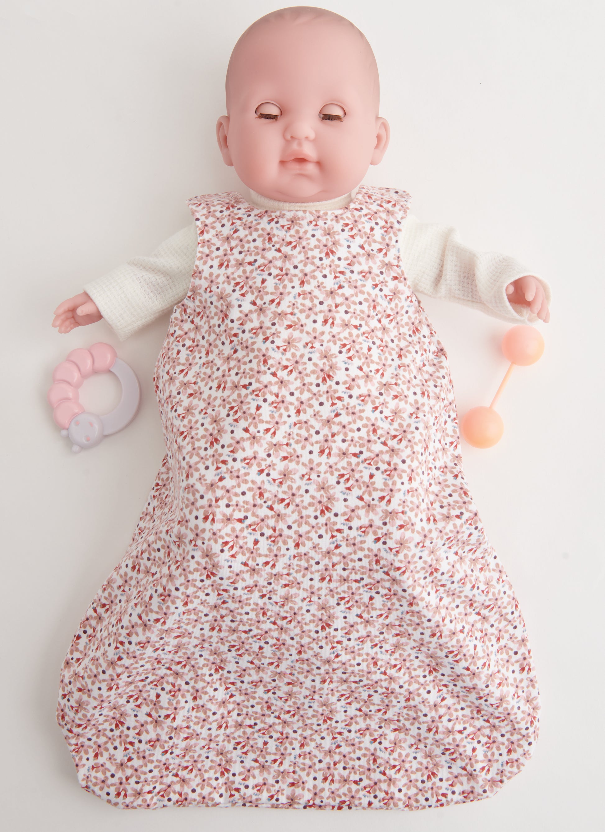 All the must-haves for 38cm baby dolls. Knit bodysuits with long or short sleeves have back and crotch hook and loop tape closures. Pull on knit pants have elasticized waist and attached feet. Knit hat with band has knotted top. Bib, lined diaper, sleep sack and swaddle have hook and loop tape closures. Carrier with adjustable shoulder straps has front zipper for easy doll access. See envelope for more information.