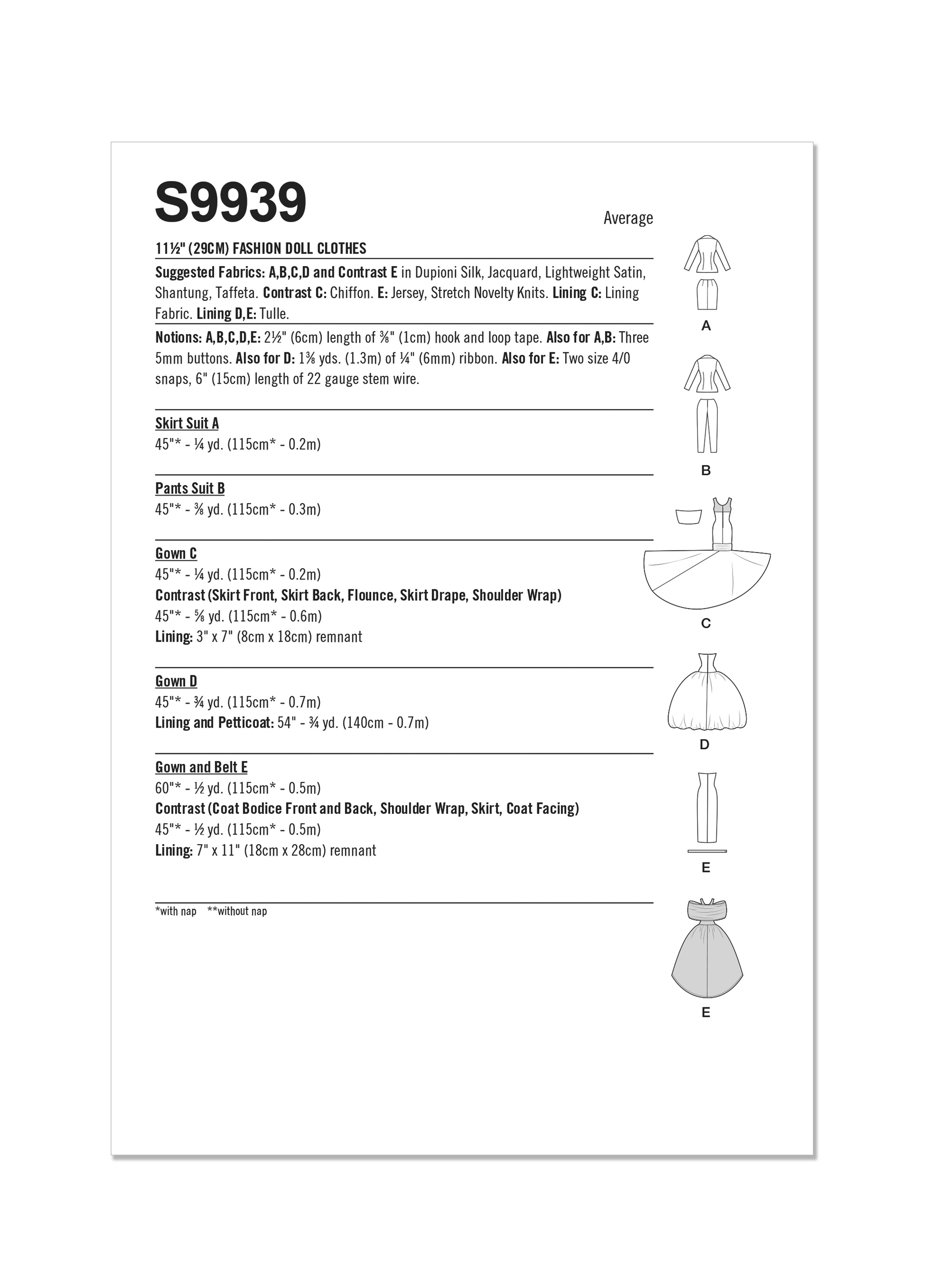 Red carpet-ready fashions for 29.21cm fashion dolls include tailored skirt or pants suit with notched collar, slim skirt or pants and mini button trim and evening gowns. Slim fit gown with V-neckline and extravagant flared skirt has ruched hem band and matching wrap. Sleeveless gown with dropped waist has bubble hem. Knit halter gown has matching belt and is worn with wrap style coat with shoulder drape, wired waistline and high-low hemmed full skirt. See envelope for more information.