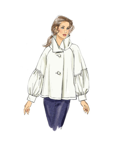 Button-front swing tops have raglan sleeves with variations. B, C: Button cuff.