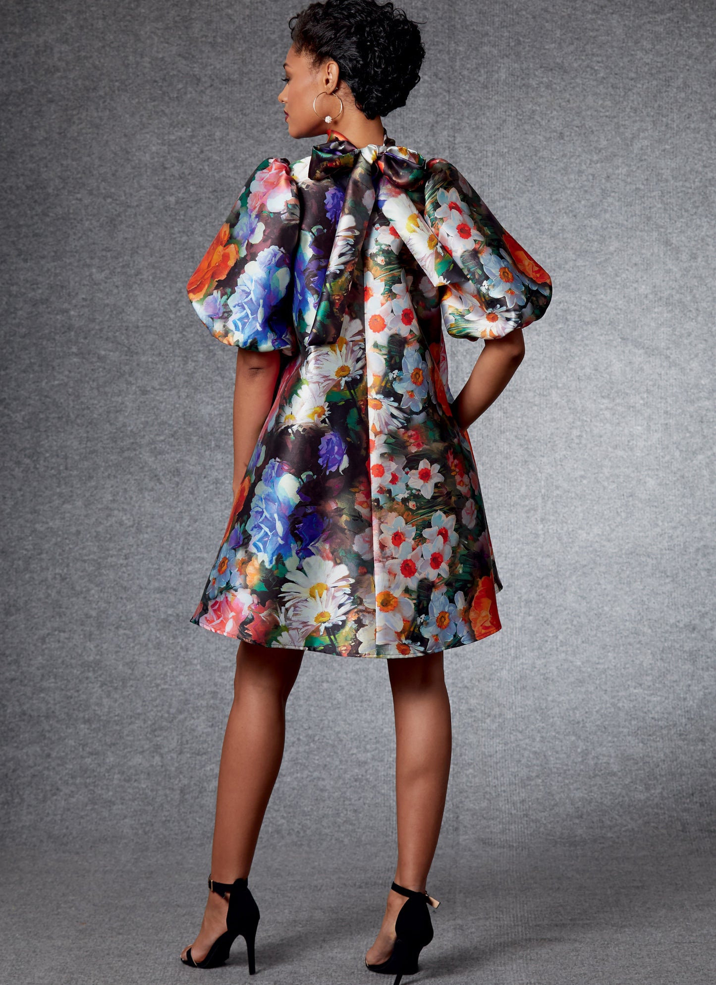 | Very loose-fitting, lined pullover dress, stand up collar extending into ties in the back, slit opening at the neck, side seam pockets, balloon sleeves with stay. |