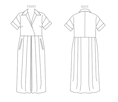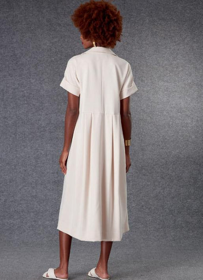 Misses' loose-fitting, partially lined pullover dress has dropped shoulders, short sleeves with turn back cuffs, bust darts, waistline pleats, welt pockets.