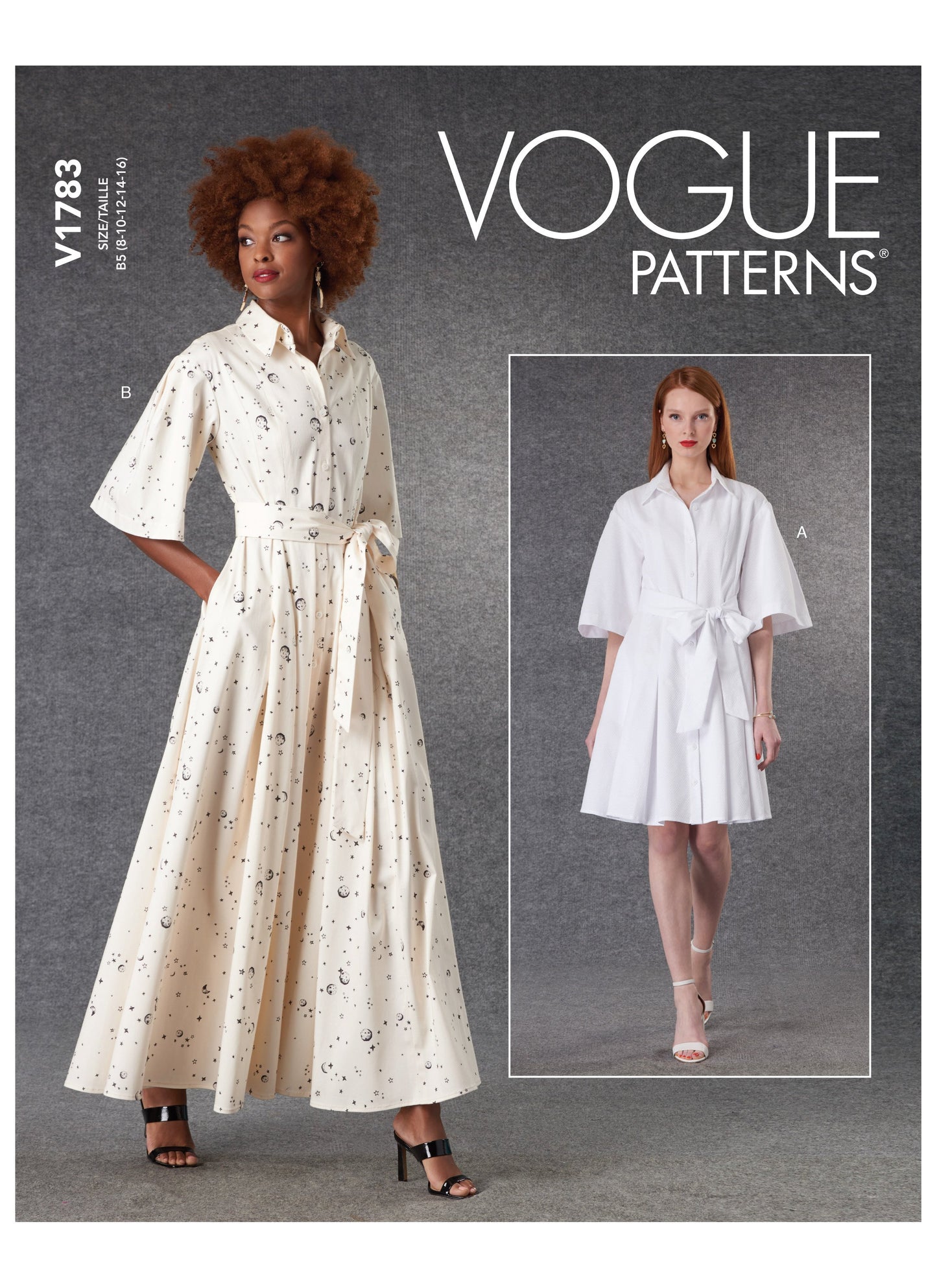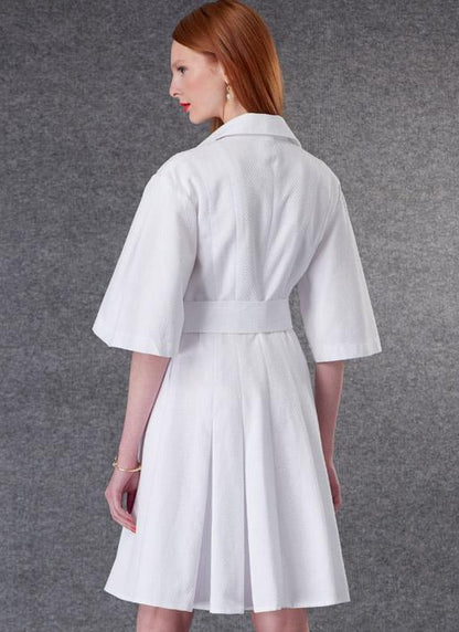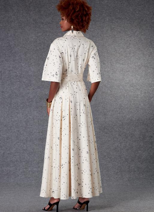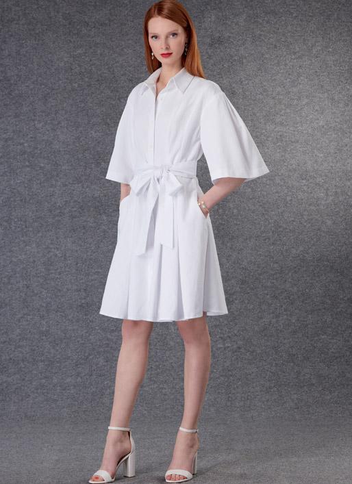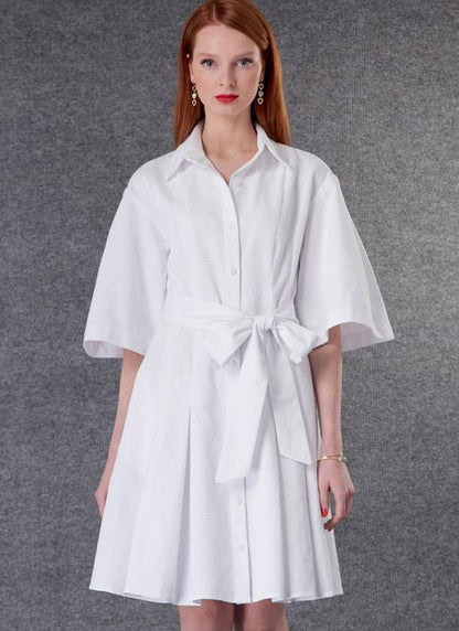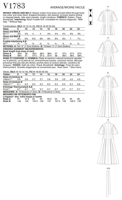 Misses' button front dress and belt (fitted through bust) has collar and collar band, dropped shoulders, bell sleeves, princess seams ending in released pleats, side seam pockets, length variations.