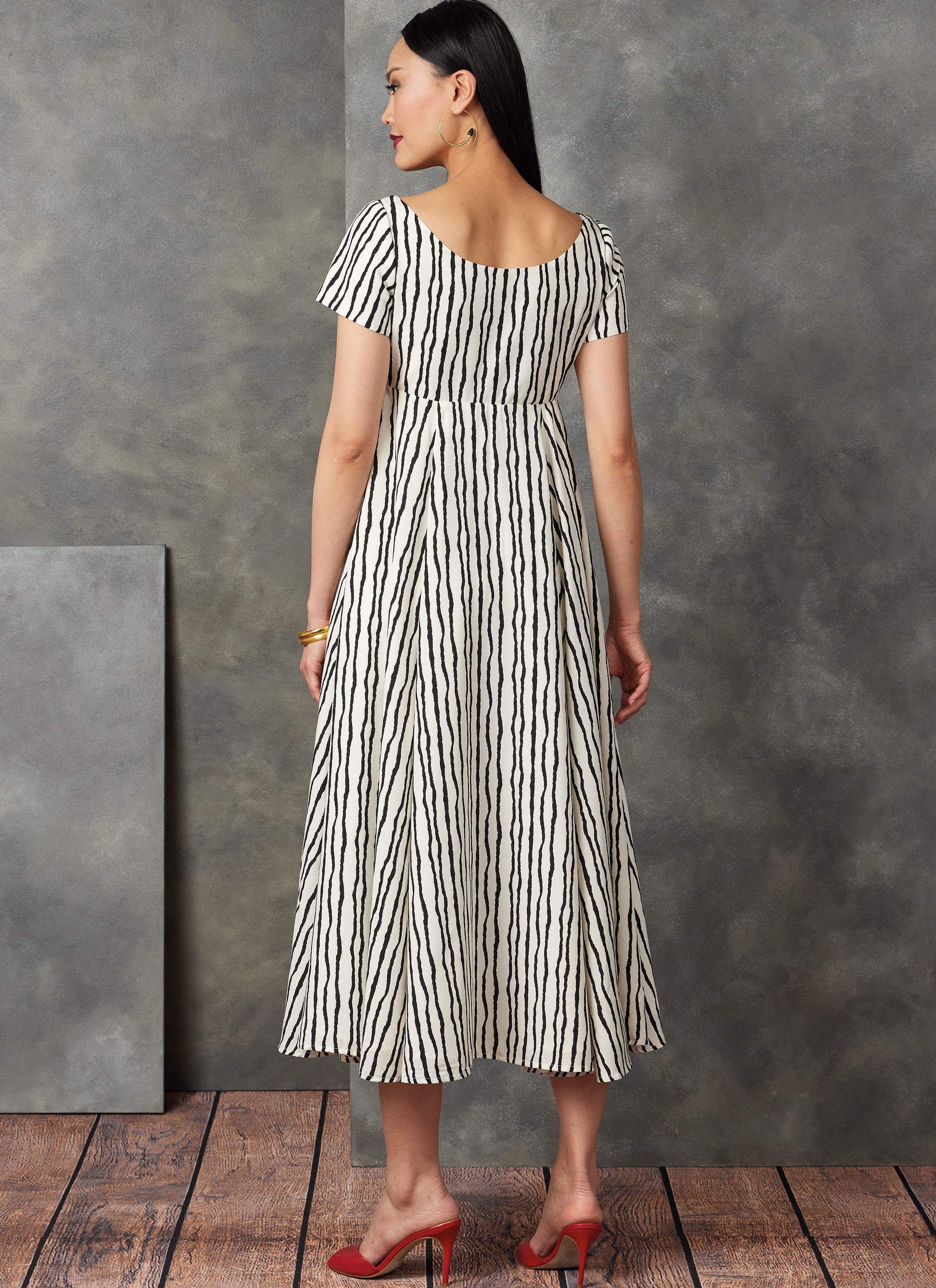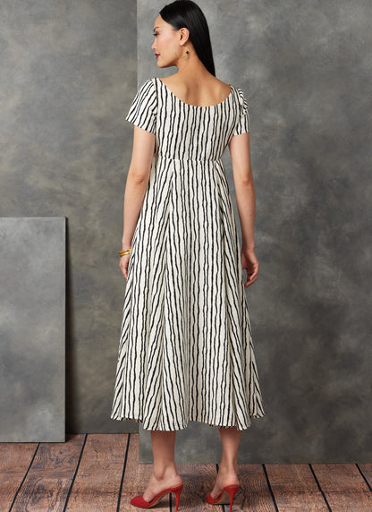 Tops (close-fitting through bust) are lined to edge and have off-the-shoulder sweetheart necklines. Top features empire waist seaming, front button closure with bias loops, open front, and length and sleeve variations. Shorts and tapered pants (fitted through hips) have side button waistband, slanted pockets and side zipper.
