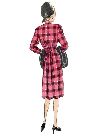 Full length coat has tie belt drawn through casing at back that is pulled through side-front seams to regulate fullness. Built-up neckline is dart fitted at front. Standing band collar across back neck. Long sleeves are set into deep armholes.
