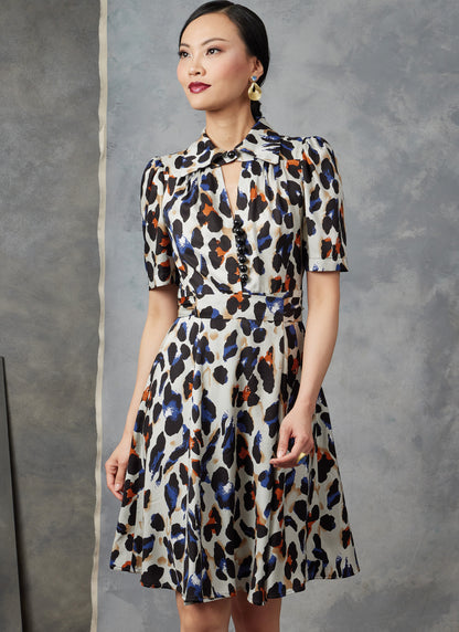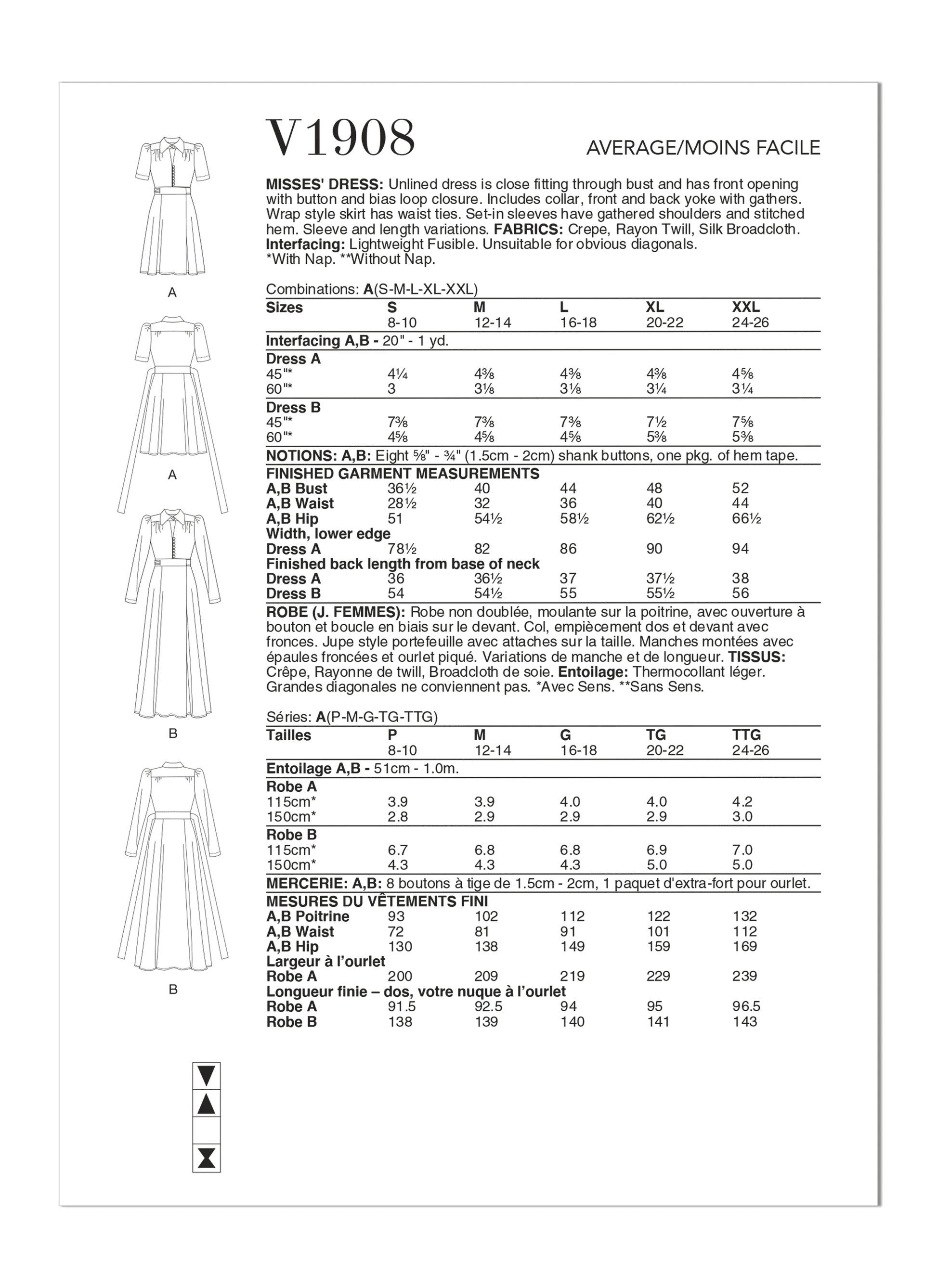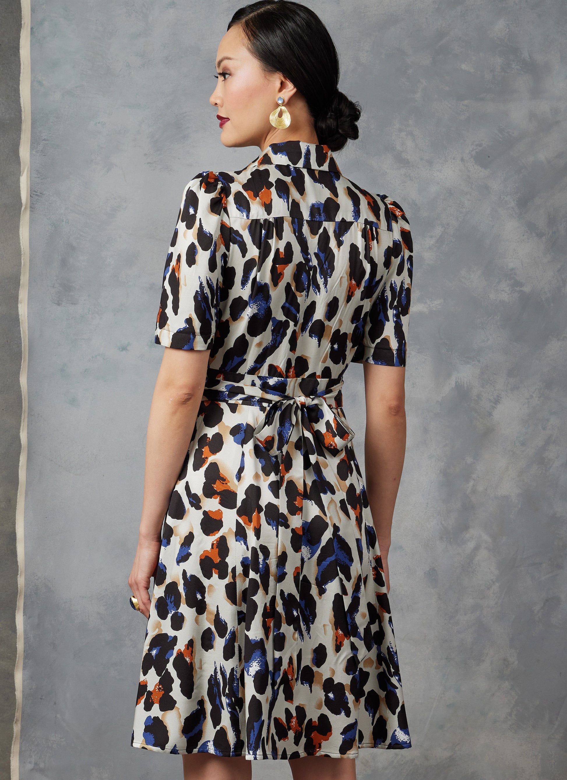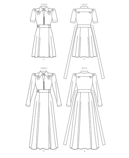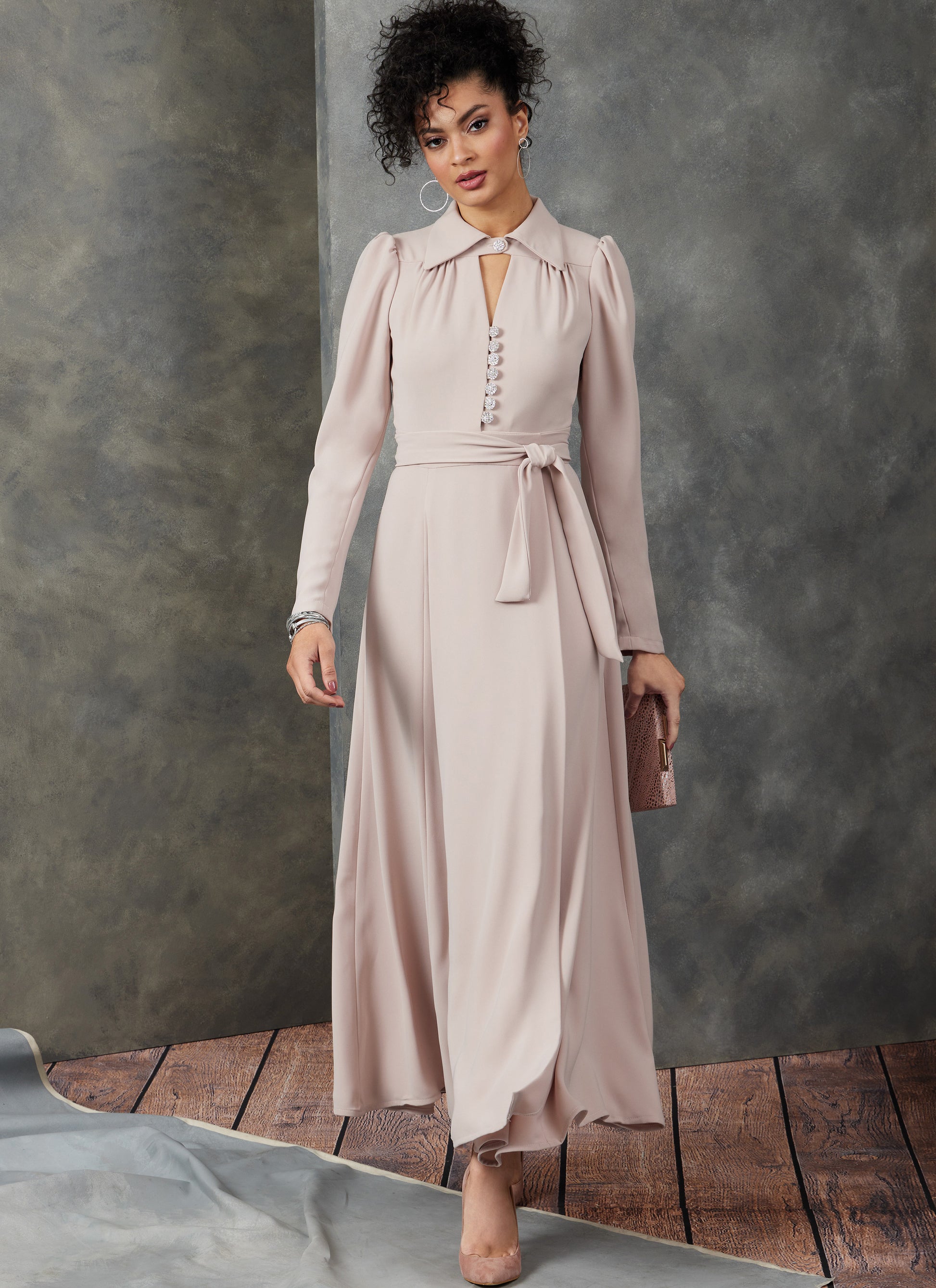 Unlined dress is close fitting through bust and has front opening with button and bias loop closure. Includes collar, front and back yoke with gathers. Wrap style skirt has waist ties. Set-in sleeves have gathered shoulders and stitched hem. Sleeve and length variations.