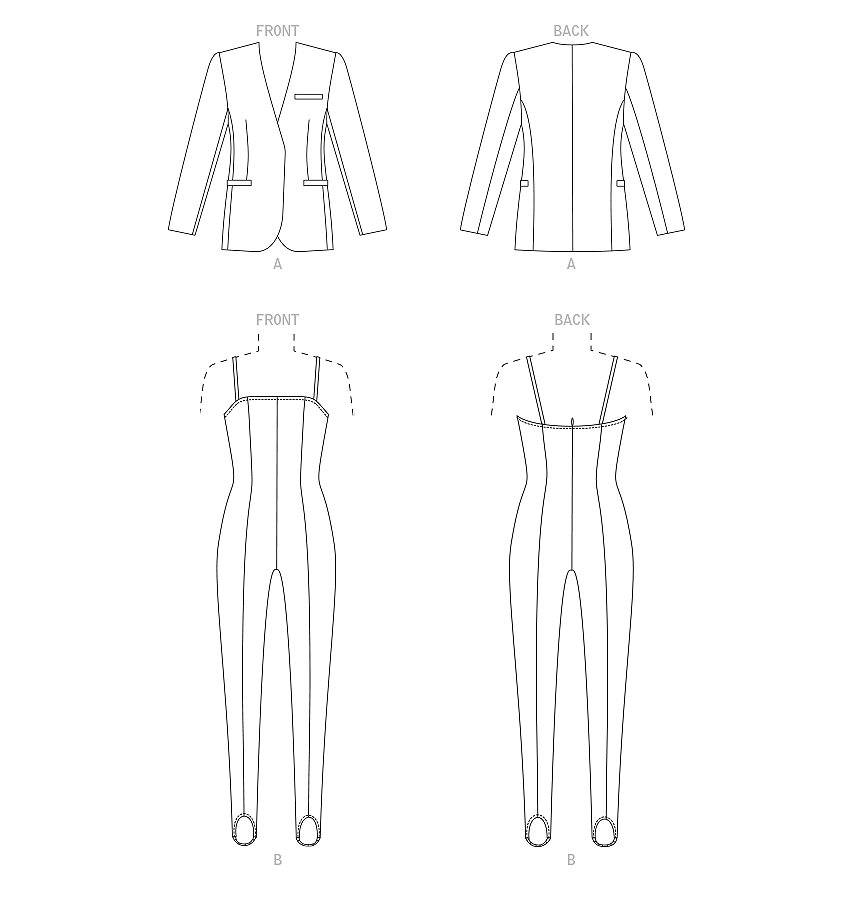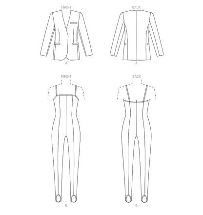 Lined blazer, semi-fitted, has shoulder pads, side panels, welt pockets and two-piece sleeves. Close-fitting knit jumpsuit has princess seams, shoulder straps, neckline finished with elastic, invisible back zipper, and stirrups with elastic under feet.