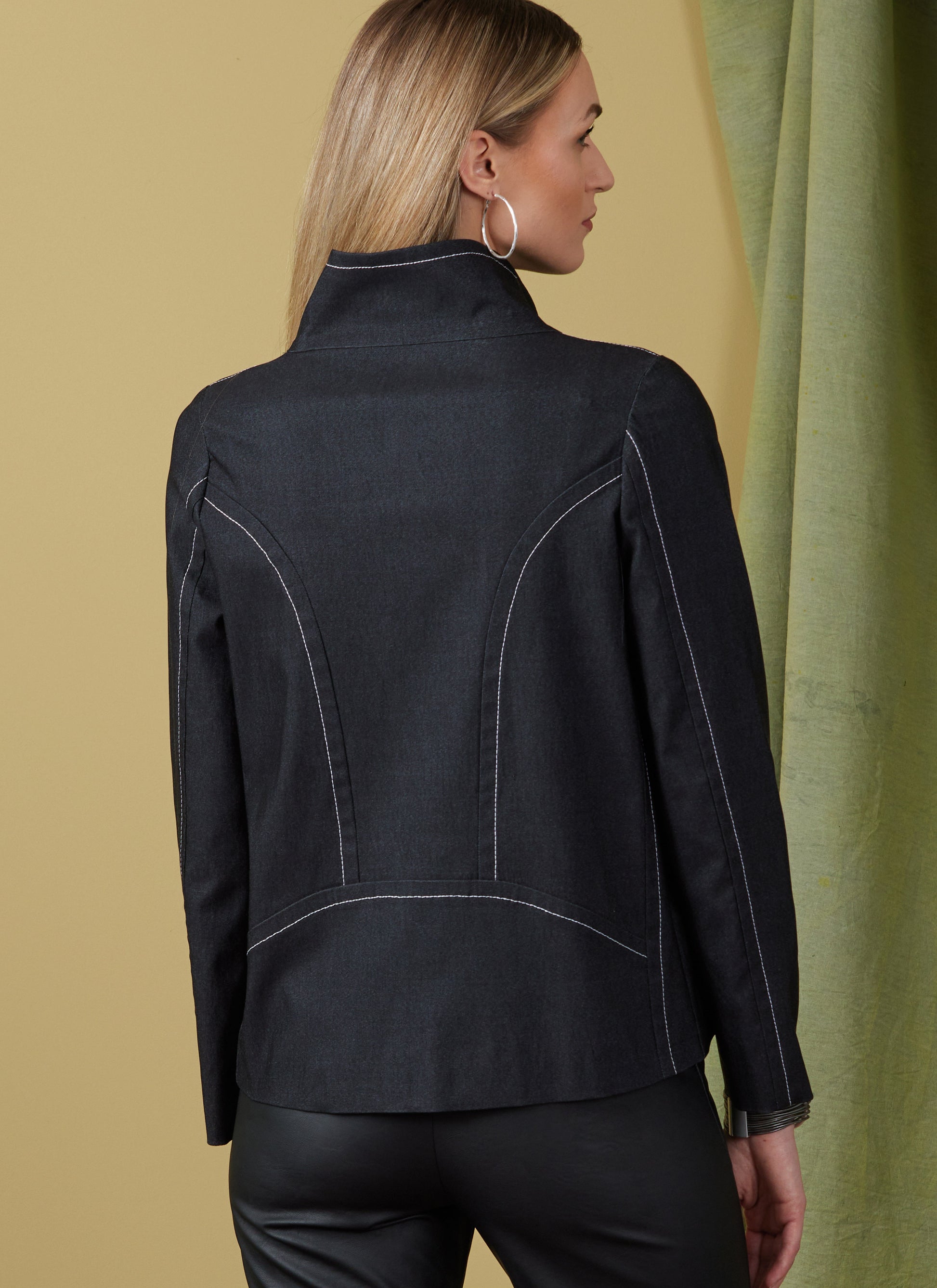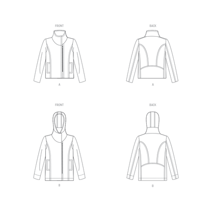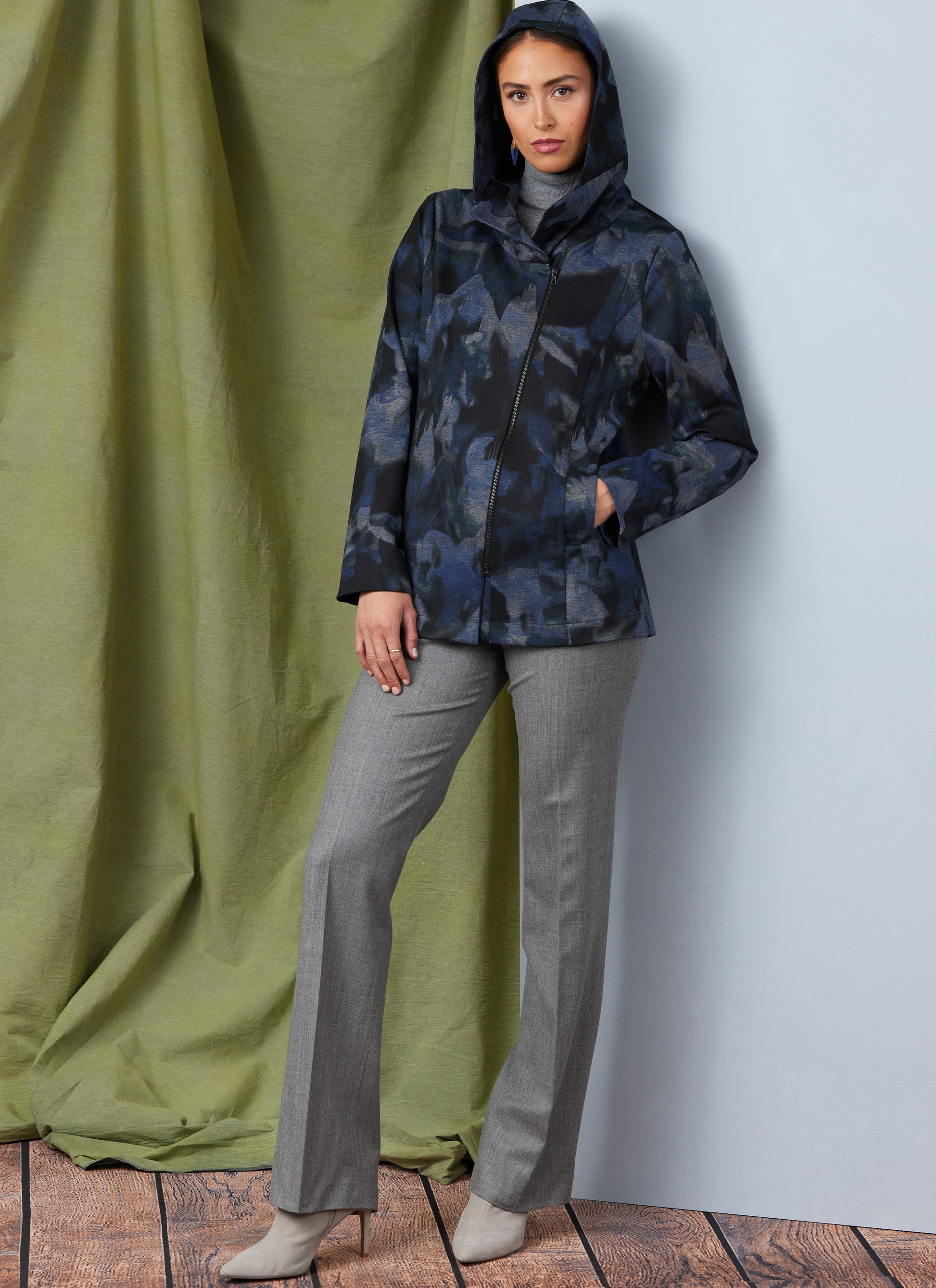 •Semi-fitted jacket in two lengths features an asymmetric front with separating zipper, princess seams, two-piece sleeves, and lining in welt pockets. View B has hood.