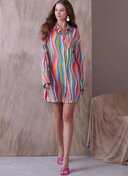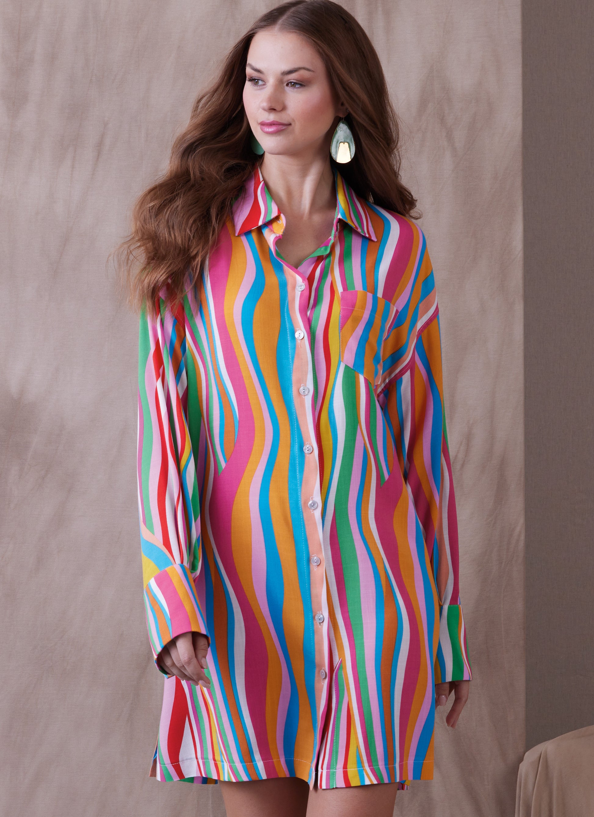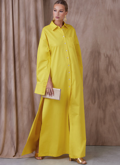 Button-front A-line dress, loose-fitting through bust, has dropped shoulders, collar, neckband, patch pocket, side slits and length variations. Long sleeves have concealed button closure along under seam and button cuffs.