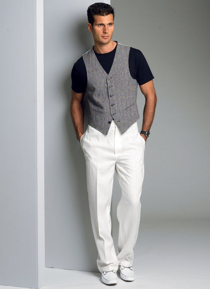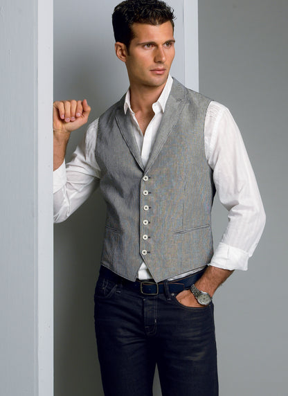 Close-fitting, lined vest has shaped front hemline, welt pockets and back tie with purchased buckle. A:collar, side panels. B:side front and back seams. All backs are cut of lining fabric.