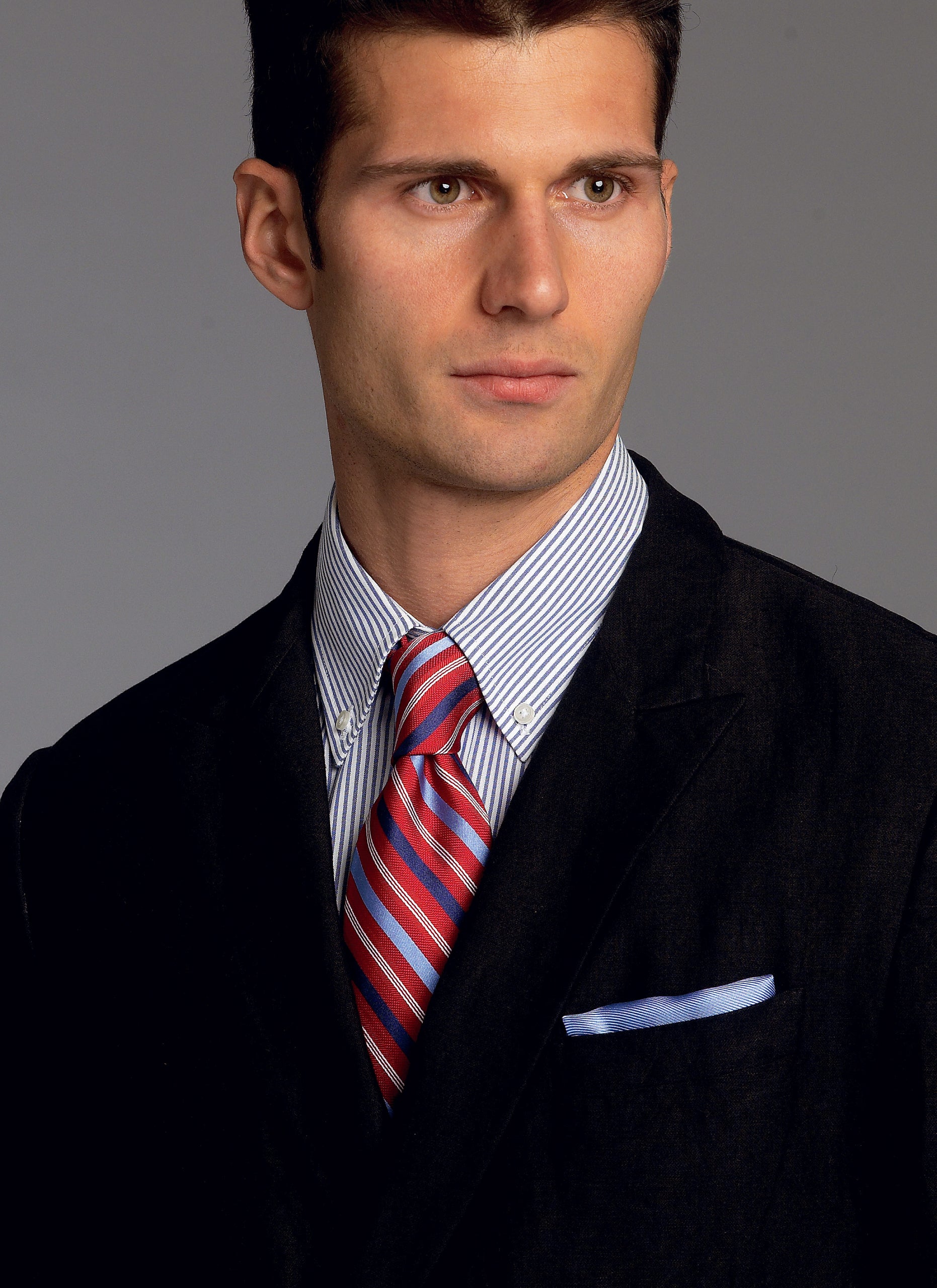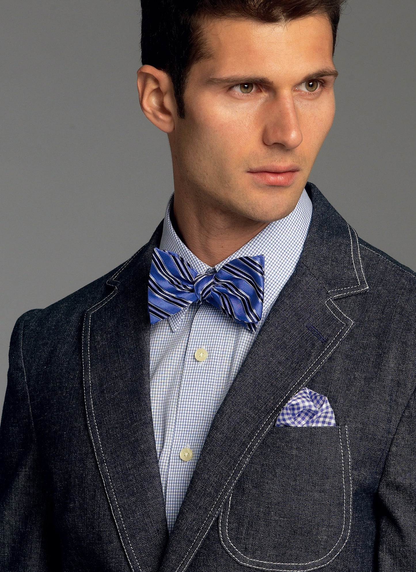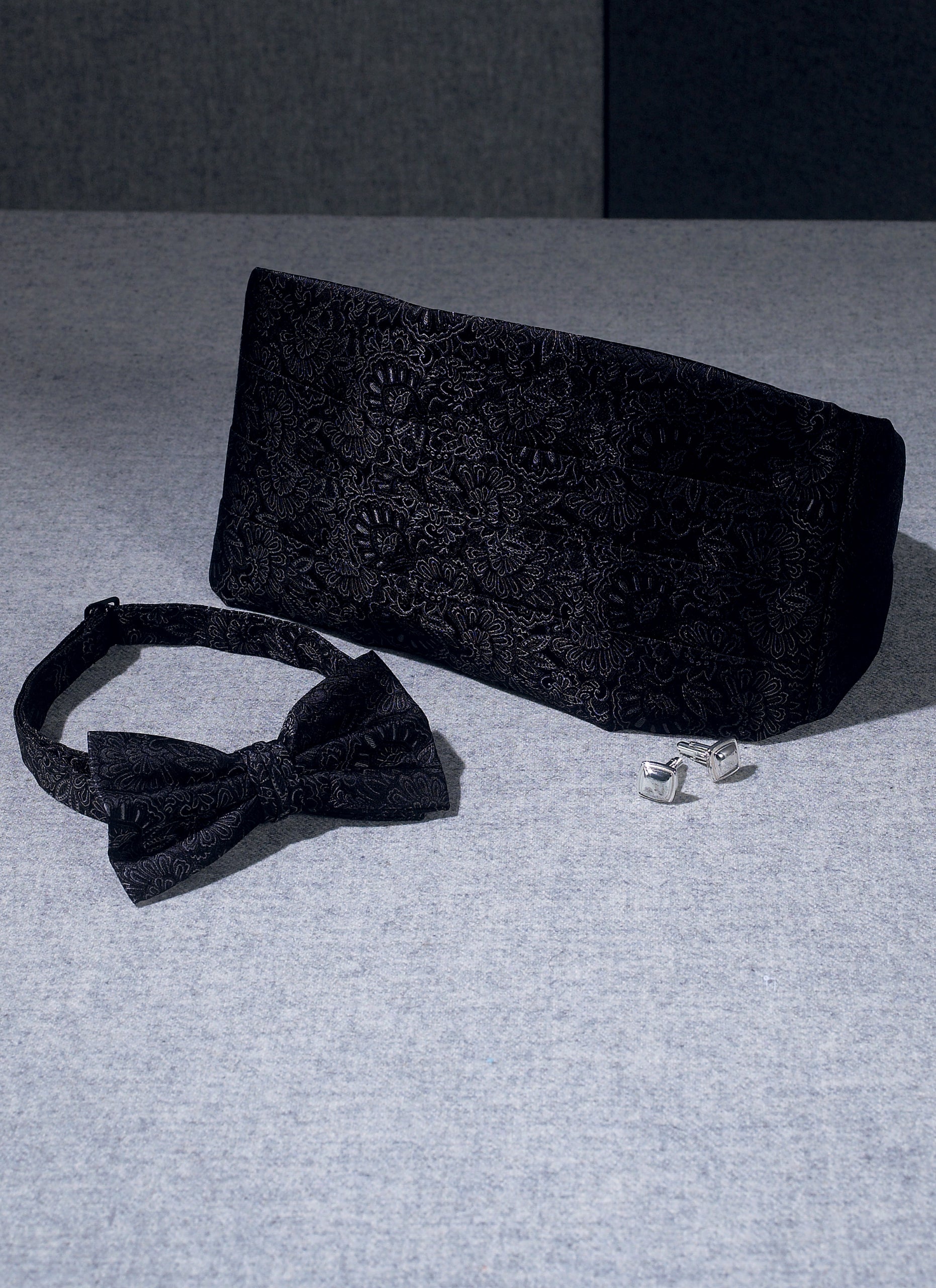Vest A includes sizes S-M-L-XL-XXL and has welt pockets. View A and Cummerbund B are lined. Pocket Square C. Bias-cut Ties D,F are 3" wide and Ties E,G are 3½" wide. Views F,G have contrast band. Bow Tie H. Pre-tied Bow Tie I.