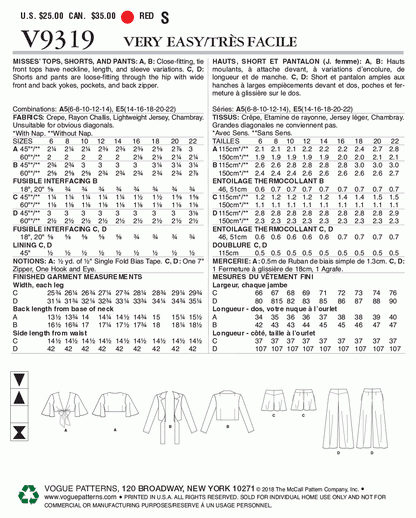 Vogue Pattern V9319 Misses' Top, Shorts and Pants